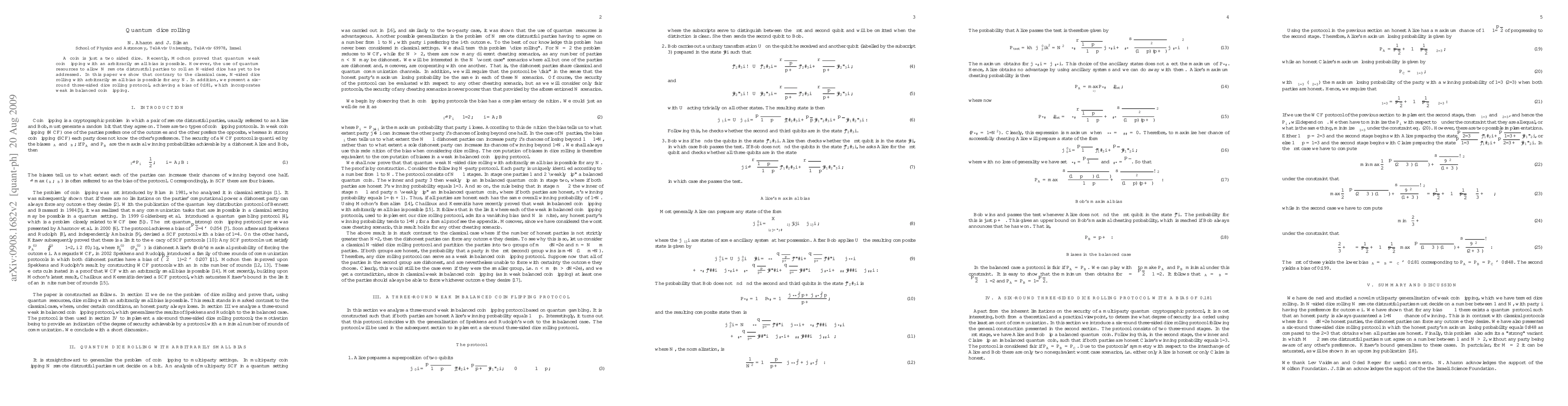 This paper demonstrates that quantum mechanics enables N-sided dice rolling with arbitrarily small bias for any N, unlike classical methods. It also introduces a six-round protocol for three-sided dice rolling with a bias of 0.181, utilizing weak imbalanced quantum coin flipping.