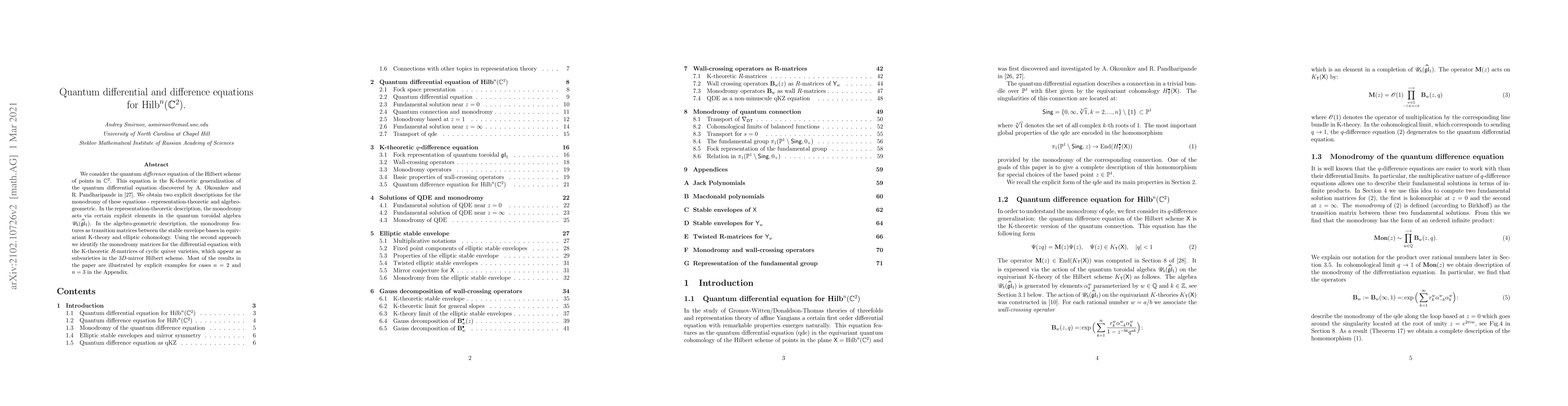 We consider the quantum difference equation of the Hilbert scheme of points in $\mathbb{C}^2$. This equation is the K-theoretic generalization of the quantum differential equation discovered by A. Okounkov and R. Pandharipande. We obtain two explicit descriptions for the monodromy of these equations - representation-theoretic and algebro-geometric. In the representation-theoretic description, the monodromy acts via certain explicit elements in the quantum toroidal algebra $\frak{gl}_1$. In the algebro-geometric description, the monodromy features as transition matrices between the stable envelope bases in the equivariant K-theory and elliptic cohomology. Using the second approach we identify the monodromy matrices for the differential equation with the K-theoretic $R$-matrices of cyclic quiver varieties, which appear as subvarieties in the $3D$-mirror Hilbert scheme. Most of the results in the paper are illustrated by explicit examples for cases $n=2$ and $n=3$ in the Appendix.