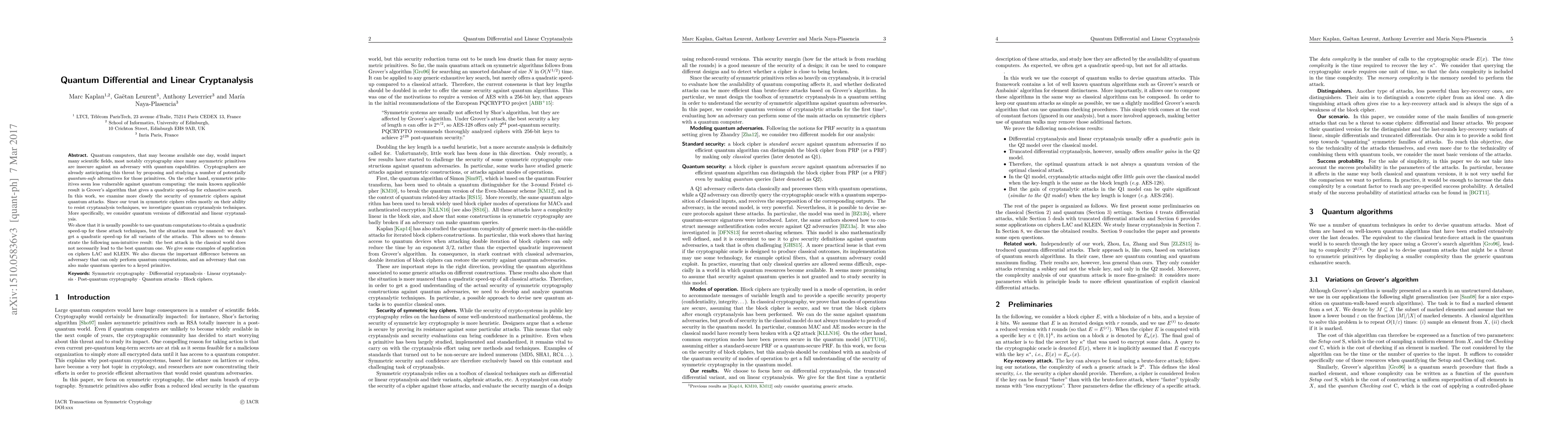 This paper investigates the security of symmetric ciphers against quantum attacks, focusing on quantum versions of differential and linear cryptanalysis. It demonstrates that while quantum computations can provide a quadratic speed-up for these techniques, the effectiveness varies by attack variant, leading to the non-intuitive result that the best classical attack does not always translate to the best quantum attack.