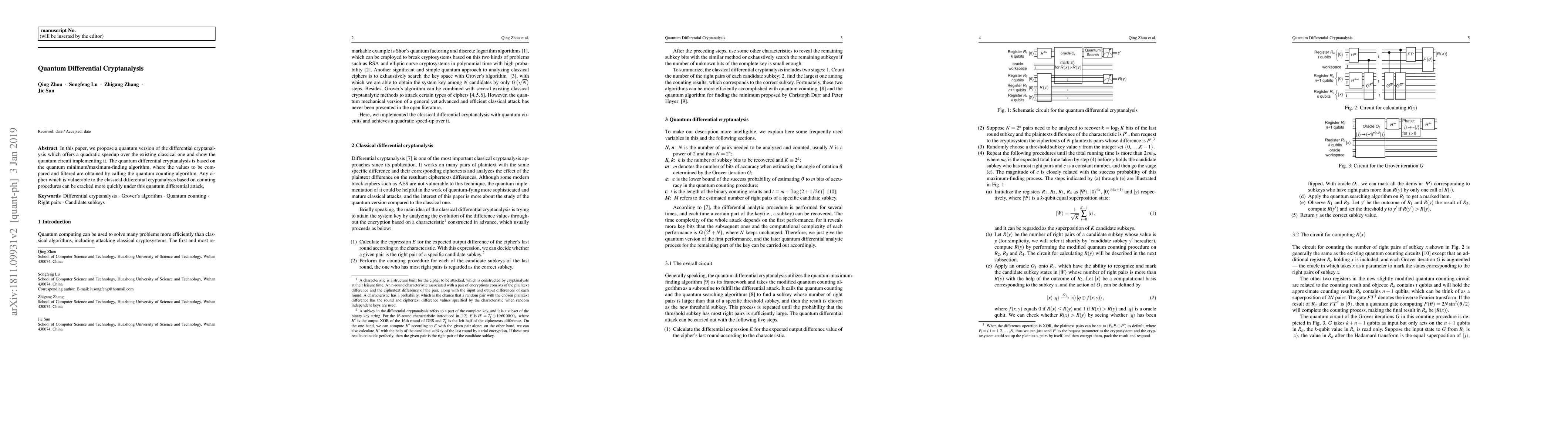 This paper introduces a quantum version of differential cryptanalysis, achieving a quadratic speedup over classical methods, and presents a quantum circuit implementation. It leverages the quantum minimum/maximum-finding algorithm and quantum counting algorithm to enhance the efficiency of cracking ciphers vulnerable to classical differential attacks.