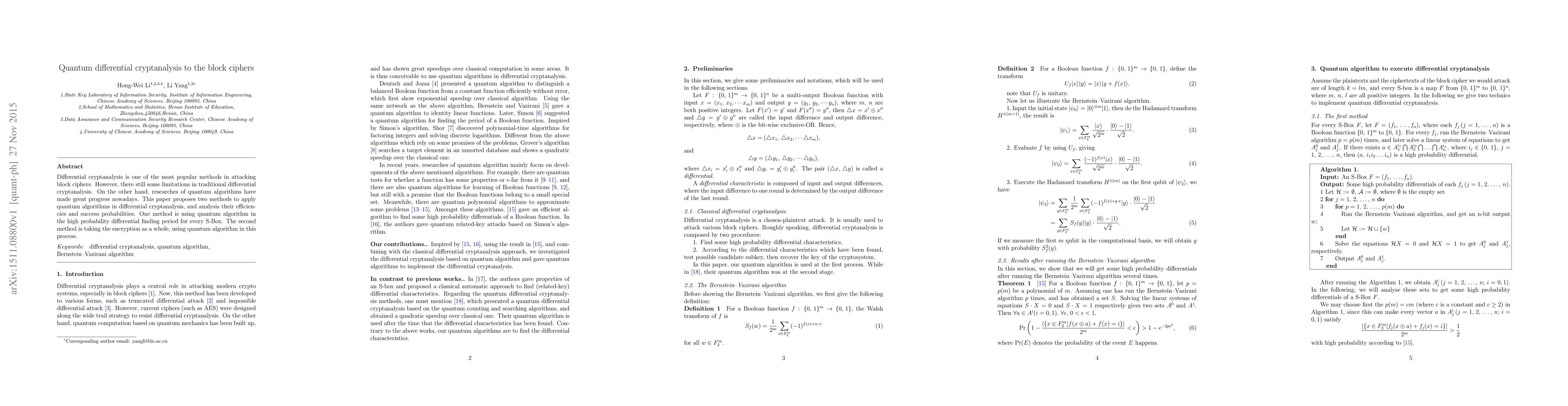 This paper proposes two quantum algorithm-based methods to enhance differential cryptanalysis of block ciphers, analyzing their efficiency and success probabilities. The first method leverages quantum algorithms to find high-probability differentials for each S-Box, while the second method applies quantum algorithms to the entire encryption process.