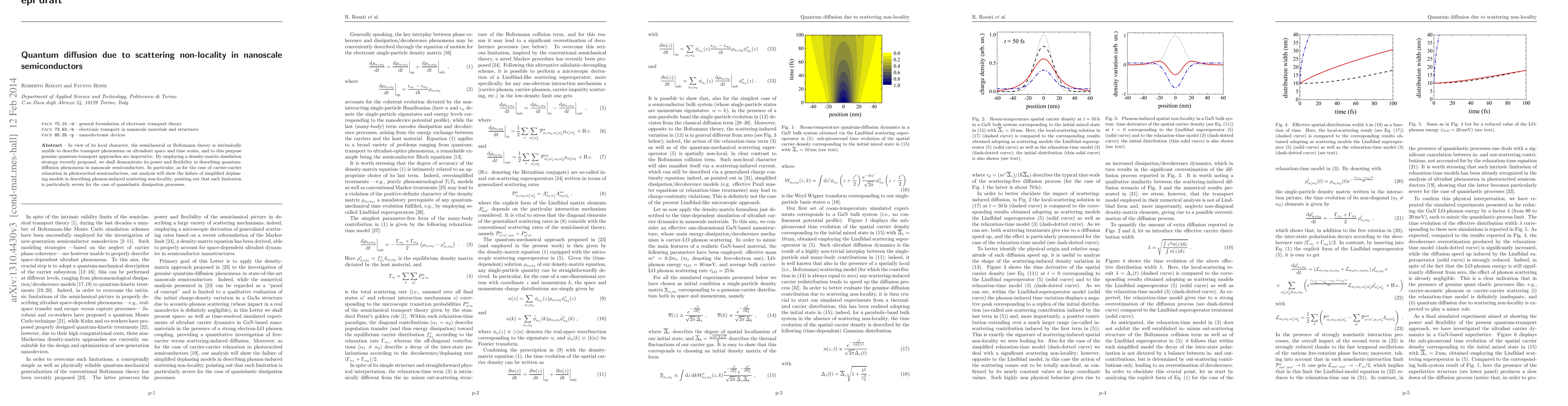 This study uses a density-matrix simulation strategy to investigate quantum diffusion in nanoscale semiconductors, highlighting the limitations of simplified dephasing models in describing phonon-induced scattering non-locality.