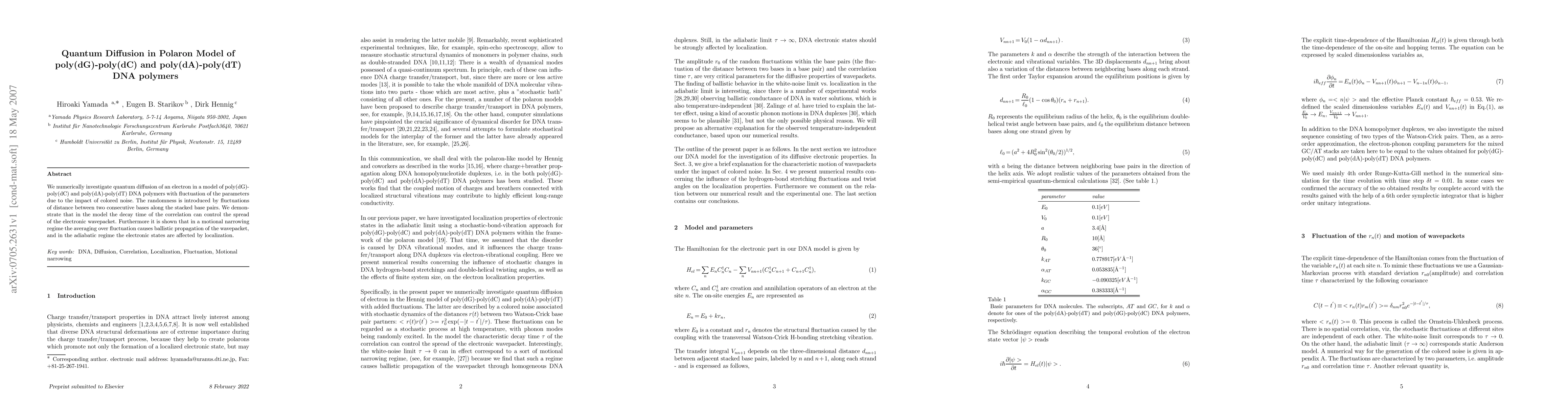 This paper numerically investigates quantum diffusion of electrons in DNA polymers, showing that correlation decay time influences the spread of the electronic wavepacket. It finds that motional narrowing leads to ballistic wavepacket propagation, while the adiabatic regime results in electronic state localization.