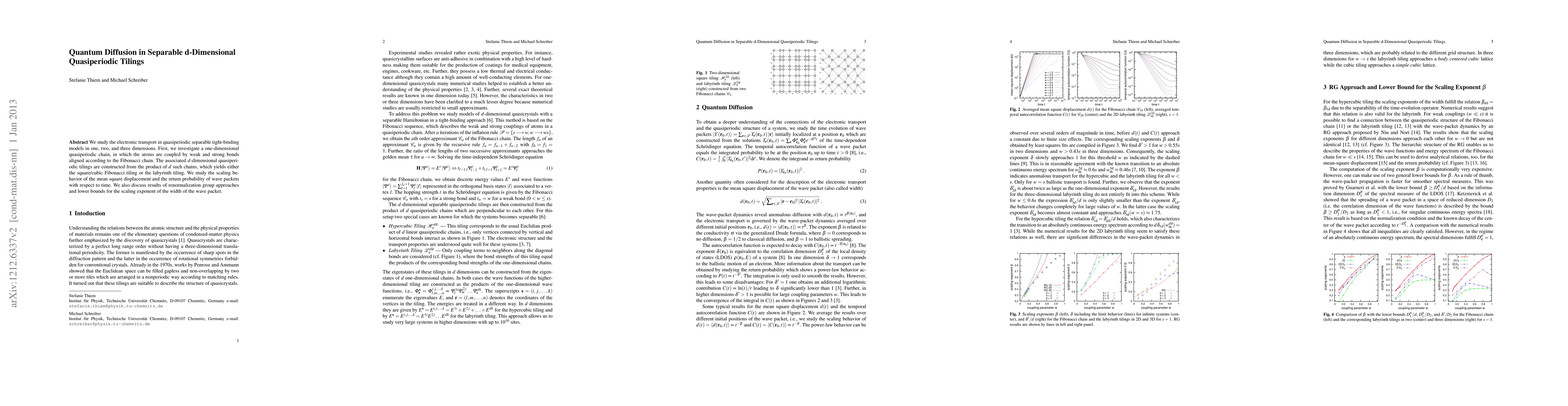 We study the electronic transport in quasiperiodic separable tight-binding models in one, two, and three dimensions. First, we investigate a one-dimensional quasiperiodic chain, in which the atoms are coupled by weak and strong bonds aligned according to the Fibonacci chain. The associated d-dimensional quasiperiodic tilings are constructed from the product of d such chains, which yields either the square/cubic Fibonacci tiling or the labyrinth tiling. We study the scaling behavior of the mean square displacement and the return probability of wave packets with respect to time. We also discuss results of renormalization group approaches and lower bounds for the scaling exponent of the width of the wave packet.