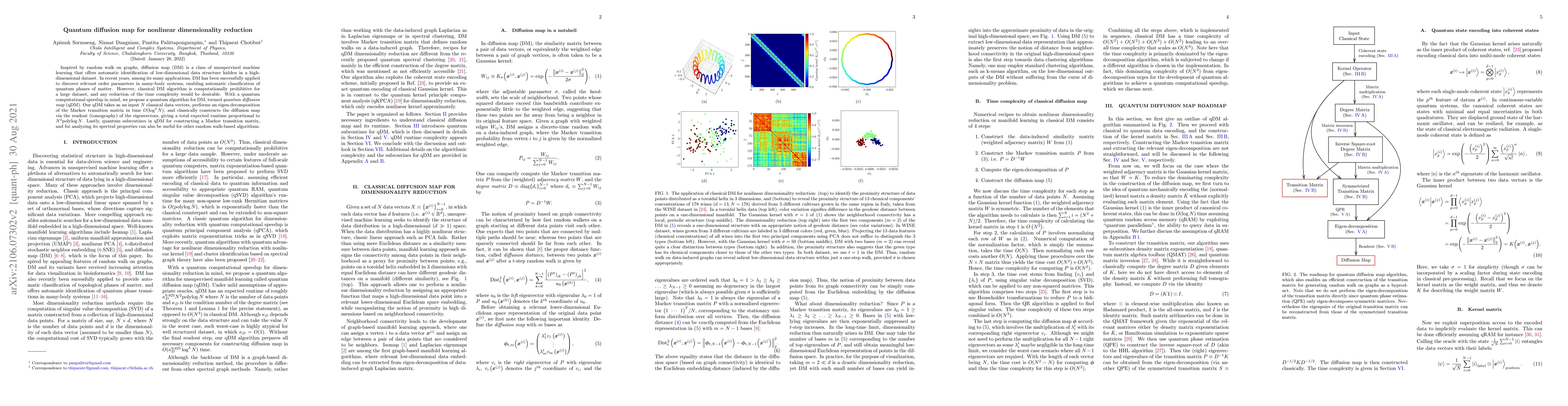 This research introduces a quantum algorithm called quantum diffusion map (qDM) for nonlinear dimensionality reduction, which significantly reduces computational complexity from classical diffusion map (DM) methods. qDM performs eigen-decomposition in O(log^3 N) time and has an overall expected runtime proportional to N^2 polylog N, offering potential speedup for large datasets and benefiting other random walk-based algorithms.