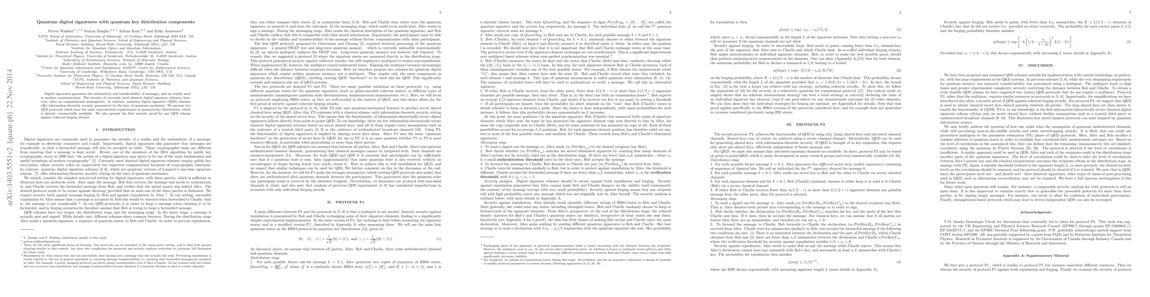 This paper introduces two quantum digital signature (QDS) protocols utilizing quantum key distribution (QKD) components, offering information-theoretic security. It also presents the first security proof against coherent forging attacks, with experimental requirements similar to commercially available QKD systems.