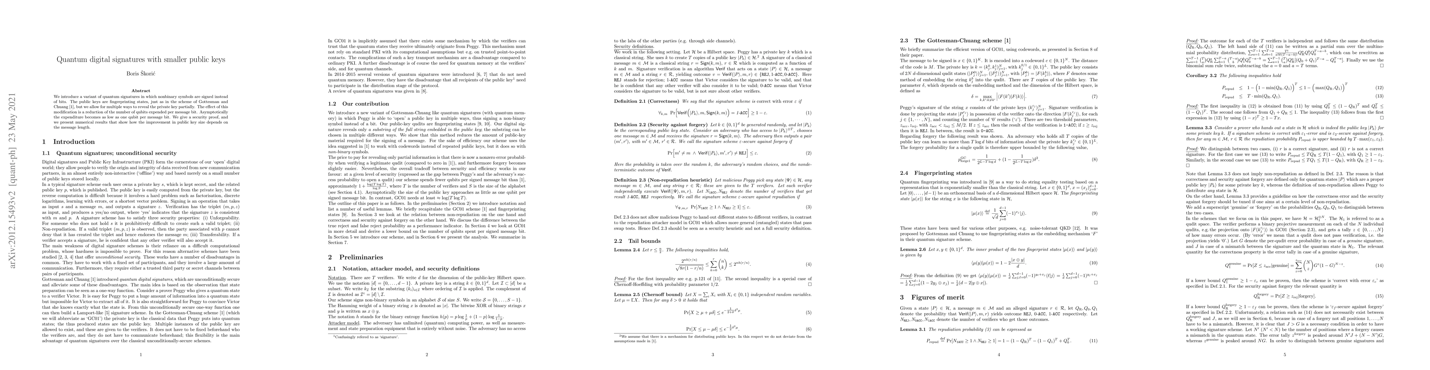 This paper proposes a quantum digital signature scheme that uses nonbinary symbols for signing, reducing the number of qubits required for each message bit compared to traditional binary schemes. The security of the method is proven, and numerical results demonstrate the efficiency gains in public key size relative to message length.