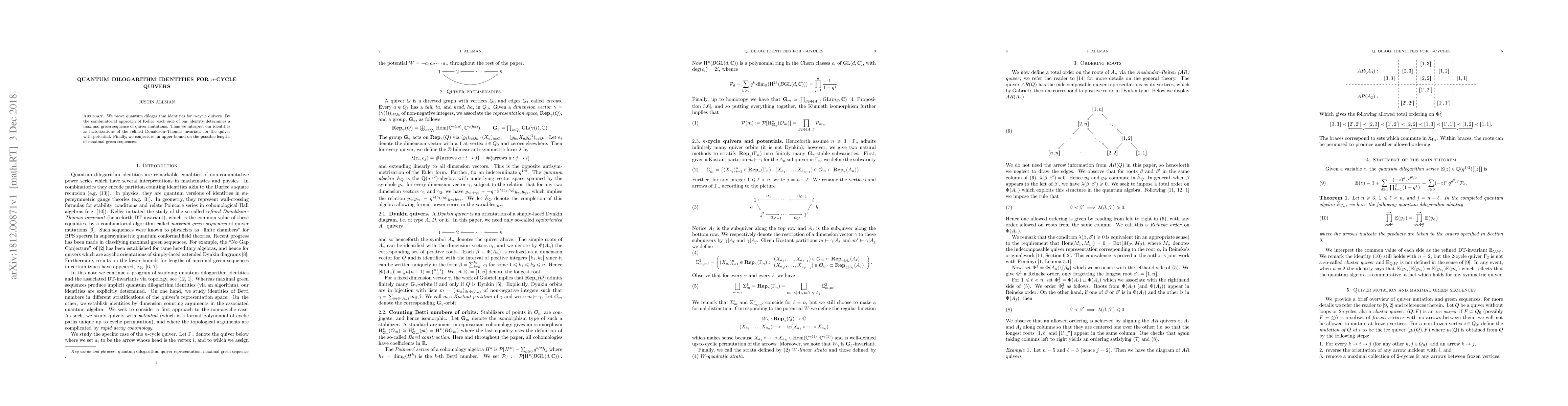 This paper proves quantum dilogarithm identities for $n$-cycle quivers using Keller's combinatorial approach, interpreting the identities as factorizations of the refined Donaldson--Thomas invariant, and conjectures an upper bound on maximal green sequence lengths.