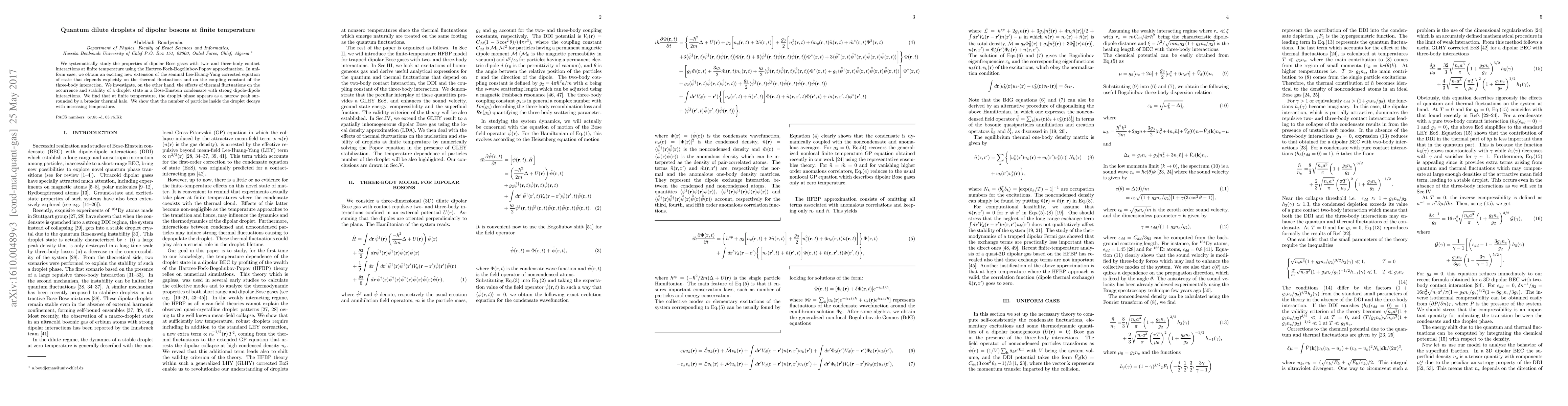 We systematically study the properties of dipolar Bose gases with two- and three-body contact interactions at finite temperature using the Hartree-Fock-Bogoliubov-Popov approximation. In uniform case, we obtain an exciting new extension of the seminal Lee-Huang-Yang corrected equation of state that depends explicitly on the thermal fluctuations and on the coupling constant of the three-body interaction. We investigate, on the other hand, the effects of thermal fluctuations on the occurrence and stability of a droplet state in a Bose-Einstein condensate with strong dipole-dipole interactions. We find that at finite temperature, the droplet phase appears as a narrow peak surrounded by a broader thermal halo. We show that the number of particles inside the droplet decays with increasing temperature.