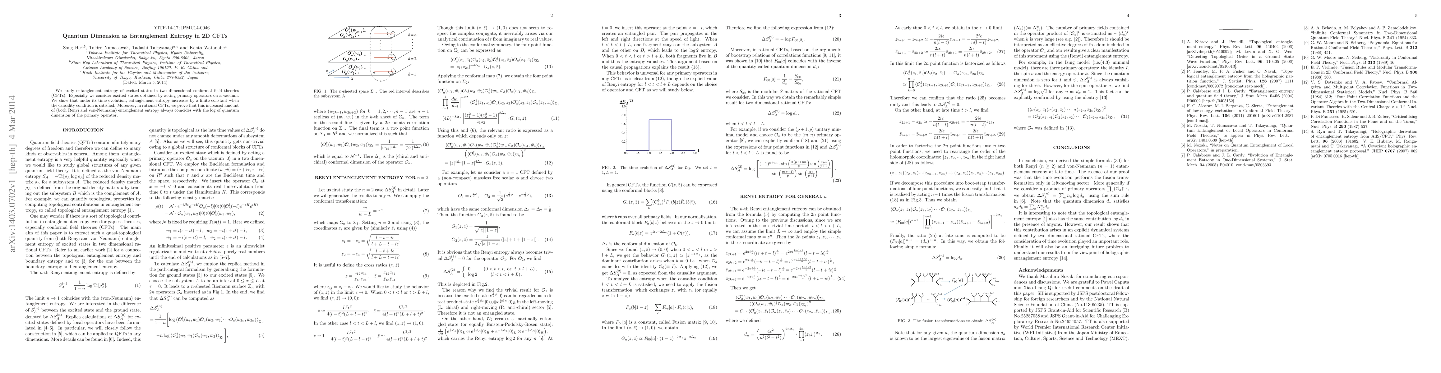 This paper investigates the entanglement entropy in 2D conformal field theories (CFTs), demonstrating that the increase in entanglement entropy due to time evolution of excited states aligns with the quantum dimension of the primary operator, specifically in rational CFTs. The study highlights the connection between quantum dimension and entanglement entropy as a measure of entanglement.