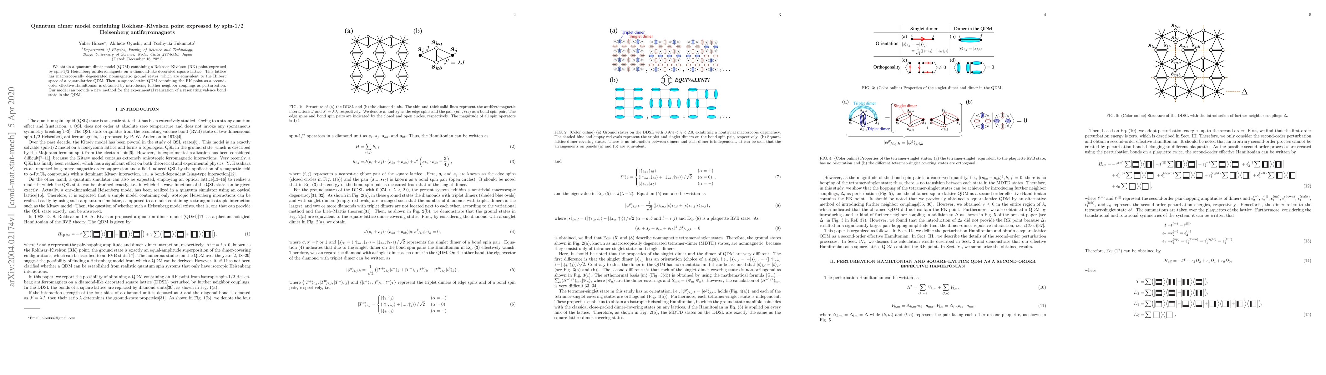 This paper constructs a quantum dimer model (QDM) with a Rokhsar-Kivelson point, expressed through spin-1/2 Heisenberg antiferromagnets on a diamond-like decorated square lattice. The model exhibits macroscopically degenerate nonmagnetic ground states, enabling the realization of a resonating valence bond state via perturbation.
