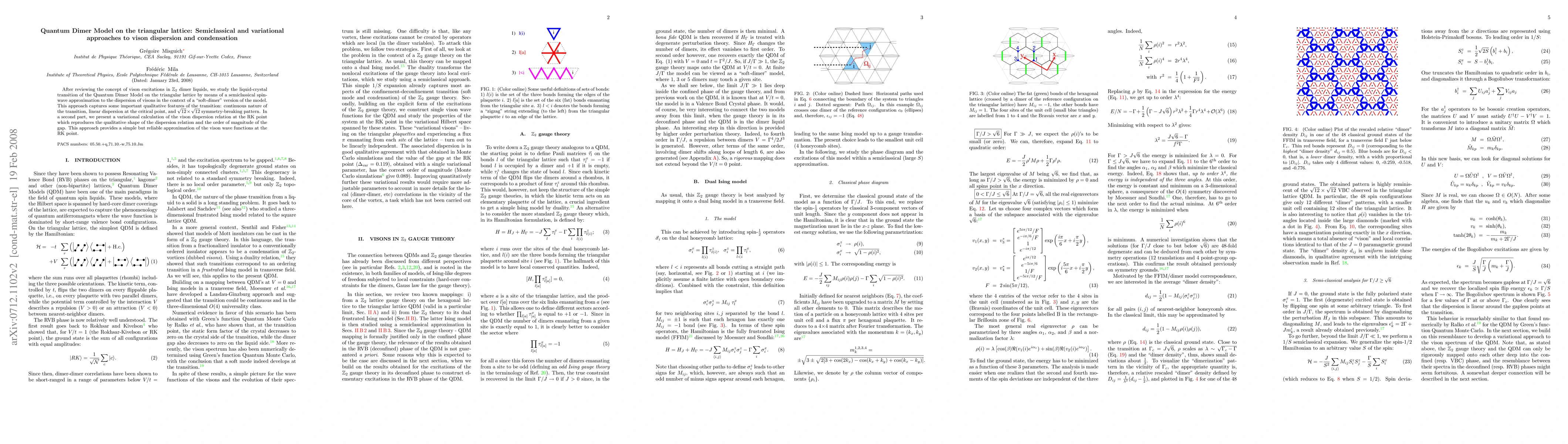 After reviewing the concept of vison excitations in Z_2 dimer liquids, we study the liquid-crystal transition of the Quantum Dimer Model on the triangular lattice by means of a semiclassical spin-wave approximation to the dispersion of visons in the context of a "soft-dimer" version of the model. This approach captures some important qualitative features of the transition: continuous nature of the transition, linear dispersion at the critical point, and \sqrt{12}x\sqrt{12} symmetry-breaking pattern. In a second part, we present a variational calculation of the vison dispersion relation at the RK point which reproduces the qualitative shape of the dispersion relation and the order of magnitude of the gap. This approach provides a simple but reliable approximation of the vison wave functions at the RK point.