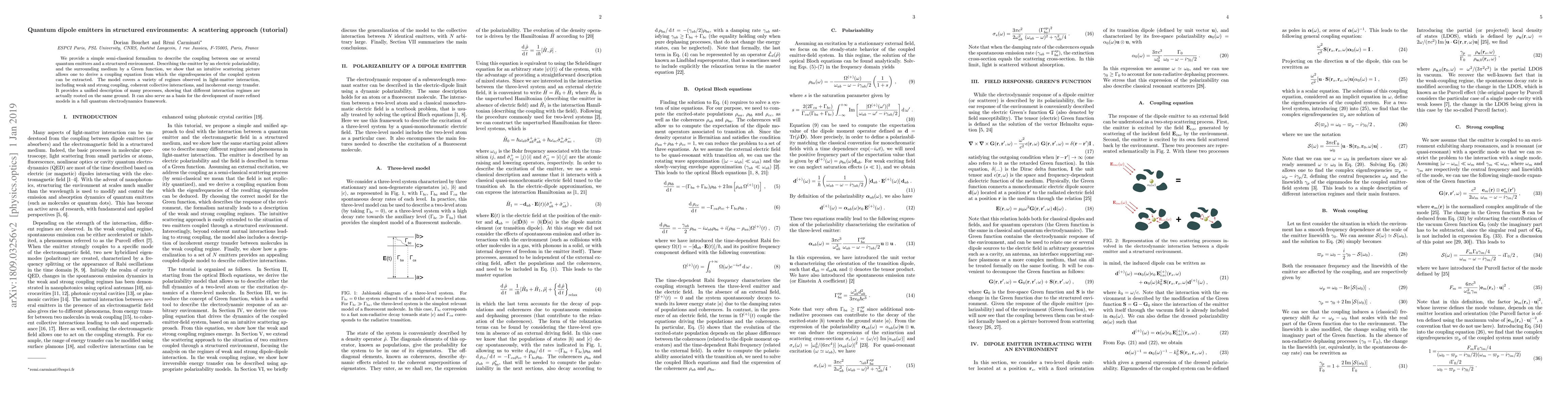 This paper presents a semi-classical formalism for describing quantum dipole emitters interacting with structured environments using a scattering approach. It derives a coupling equation from which the eigenfrequencies of the coupled system can be extracted, covering a range of light-matter interaction regimes.