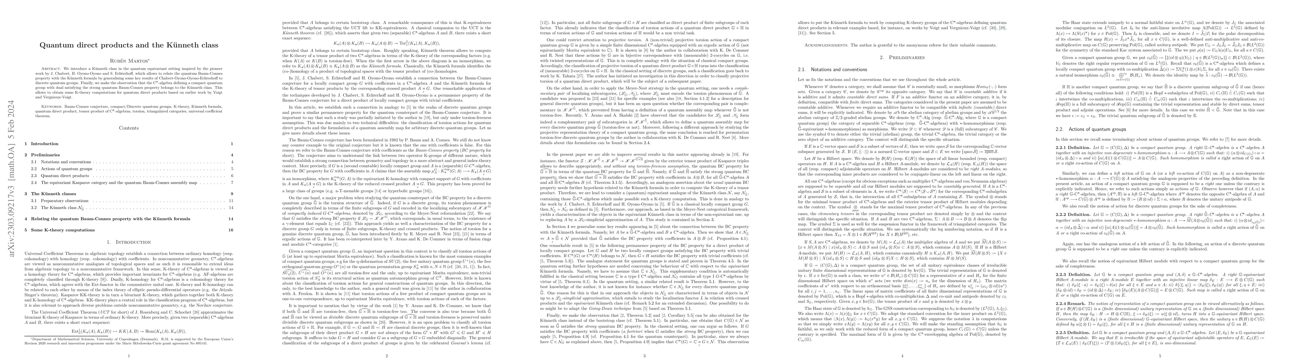 This paper introduces a K\"unneth class in the quantum equivariant setting to relate the quantum Baum-Connes property with the K\"unneth formula, generalizing prior results to discrete quantum groups. It concludes that C$^*$-algebras defining compact quantum groups with strong quantum Baum-Connes property belong to this class, enabling new K-theory computations for quantum direct products.