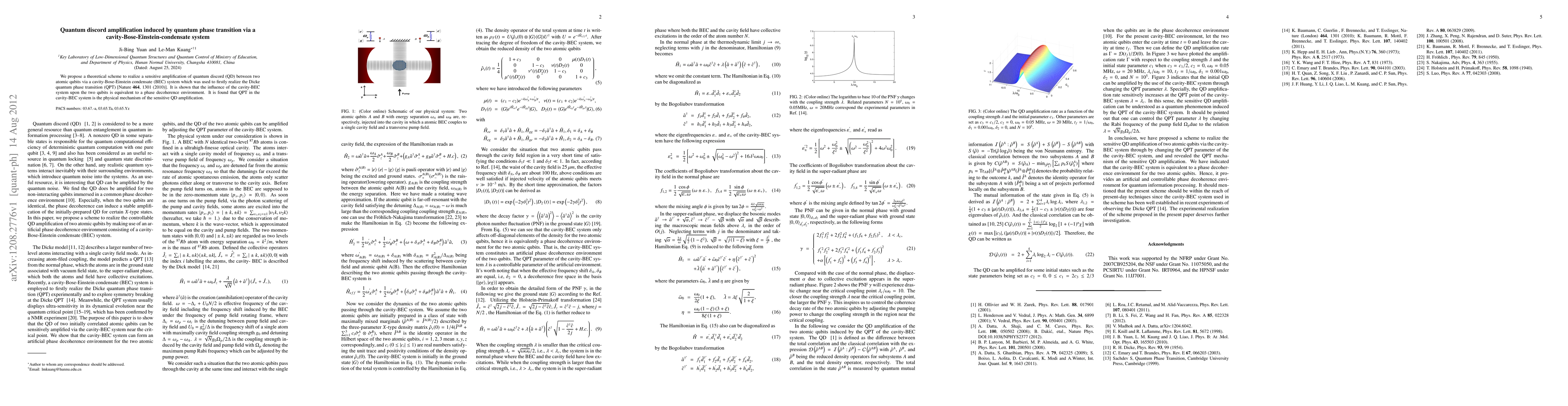 This paper proposes a theoretical scheme to amplify quantum discord between two atomic qubits using a cavity-Bose-Einstein condensate system, demonstrating that quantum phase transition in the system acts as a mechanism for this amplification. The cavity-BEC system effectively mimics a phase decoherence environment, enhancing the sensitivity of quantum discord.