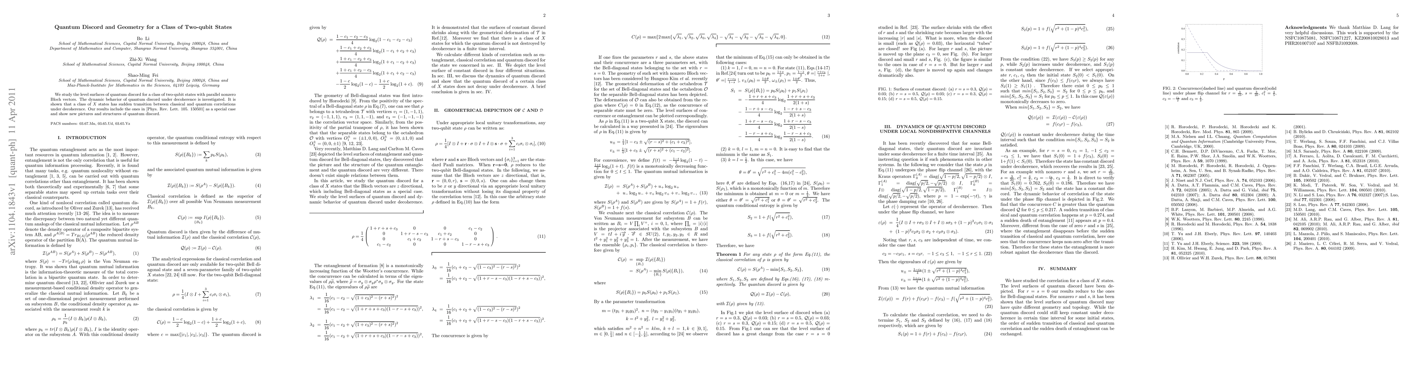 This paper investigates the geometric properties of quantum discord in a class of two-qubit states with parallel nonzero Bloch vectors, revealing a sudden transition between classical and quantum correlations under decoherence, particularly in X states. The findings extend previous results and provide new insights into the dynamics and structure of quantum discord.