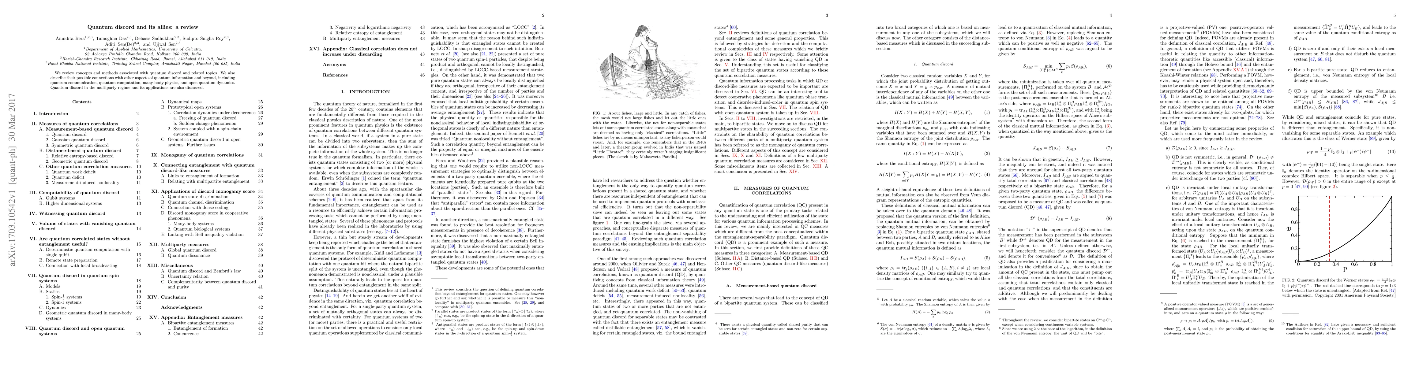 This paper reviews quantum discord and its associated methods, exploring its connections to quantum communication, computation, many-body physics, and open quantum dynamics, with a focus on multiparty scenarios and applications.