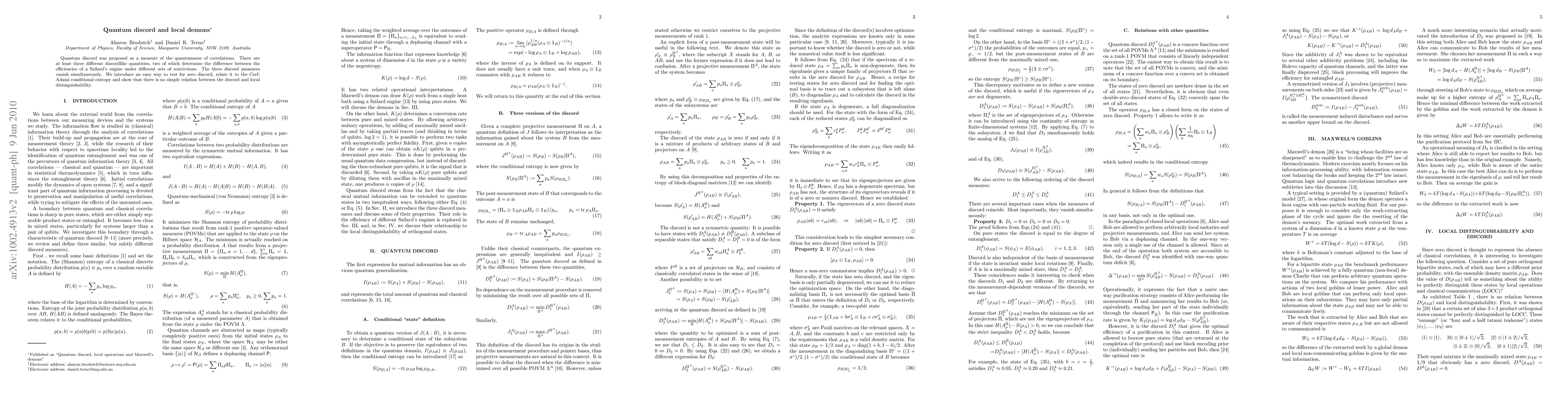 Quantum discord was proposed as a measure of the "quantumness" of correlations. There are at least three different discord-like quantities, two of which determine the difference between the efficiencies of a Szilard's engine under different sets of restrictions. The three discord measures vanish simulataneosly. We introduce an easy way to test for zero discord, relate it to the Cerf-Adami conditional entropy and show that there is no relation between the discord and the local disitnguishability.