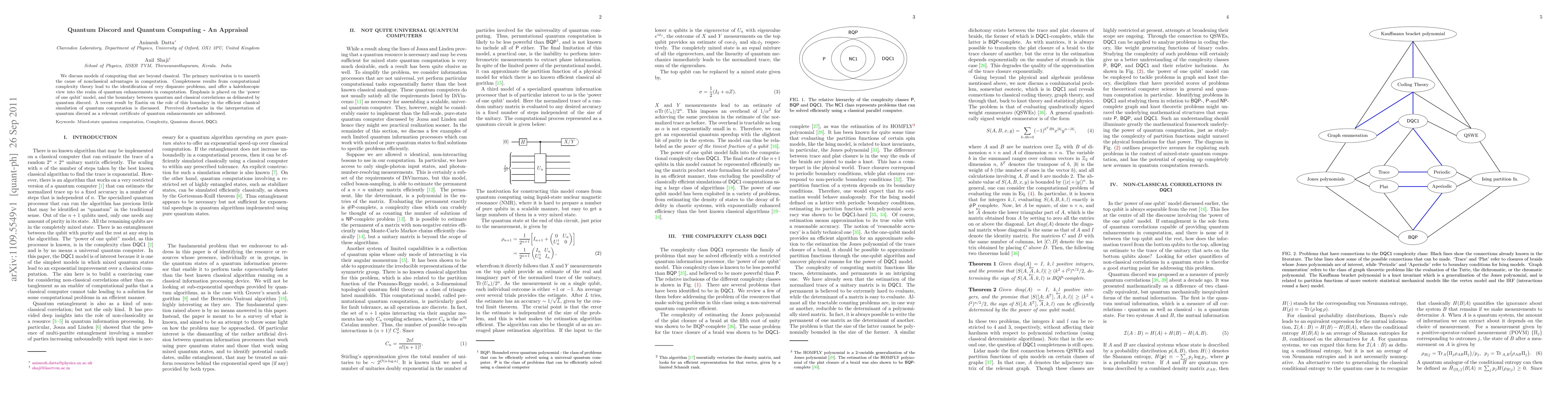 We discuss models of computing that are beyond classical. The primary motivation is to unearth the cause of nonclassical advantages in computation. Completeness results from computational complexity theory lead to the identification of very disparate problems, and offer a kaleidoscopic view into the realm of quantum enhancements in computation. Emphasis is placed on the `power of one qubit' model, and the boundary between quantum and classical correlations as delineated by quantum discord. A recent result by Eastin on the role of this boundary in the efficient classical simulation of quantum computation is discussed. Perceived drawbacks in the interpretation of quantum discord as a relevant certificate of quantum enhancements are addressed.