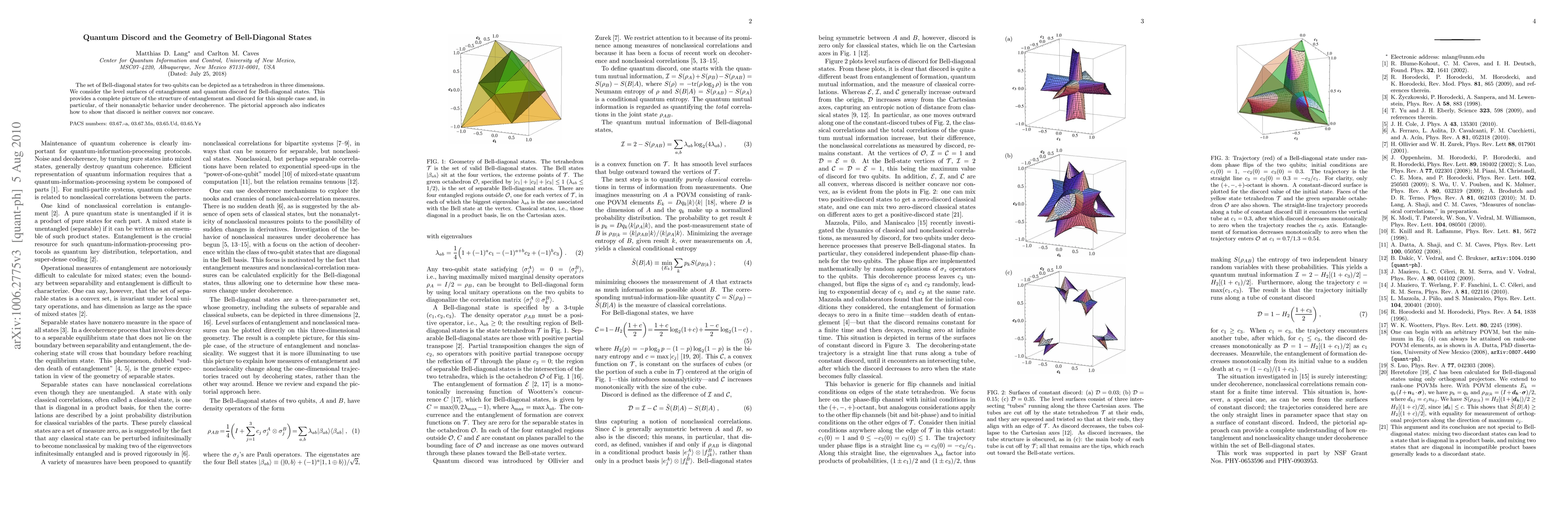 The set of Bell-diagonal states for two qubits can be depicted as a tetrahedron in three dimensions. We consider the level surfaces of entanglement and quantum discord for Bell-diagonal states. This provides a complete picture of the structure of entanglement and discord for this simple case and, in particular, of their nonanalytic behavior under decoherence. The pictorial approach also indicates how to show that discord is neither convex nor concave.