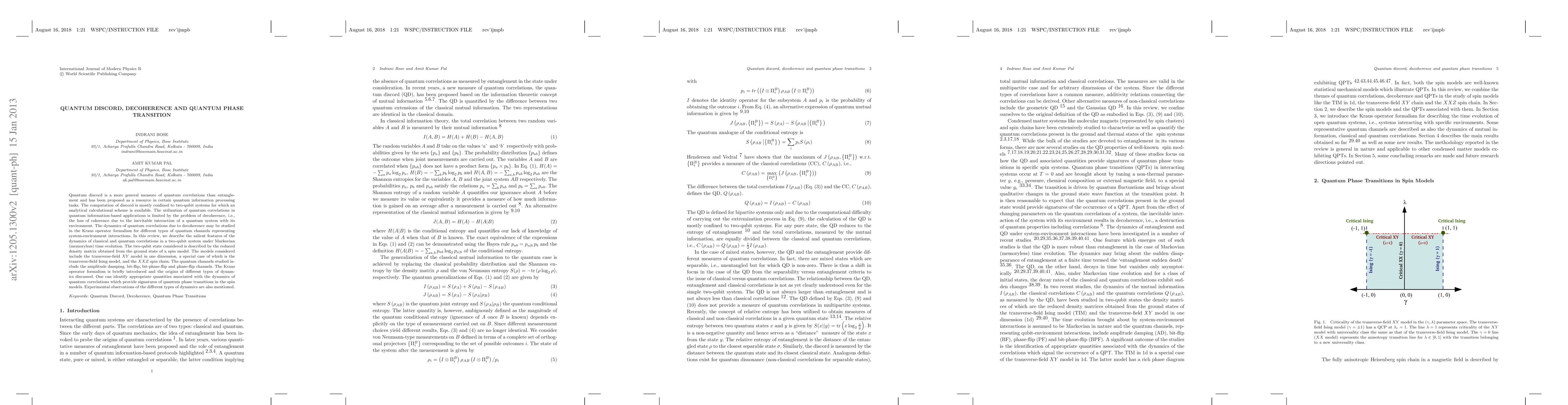 This paper reviews quantum discord, a measure of quantum correlations beyond entanglement, and its dynamics under decoherence in two-qubit systems. It explores the Kraus operator formalism to study the effects of various quantum channels on quantum correlations, identifying signatures of quantum phase transitions in spin models like the XY and Ising models.