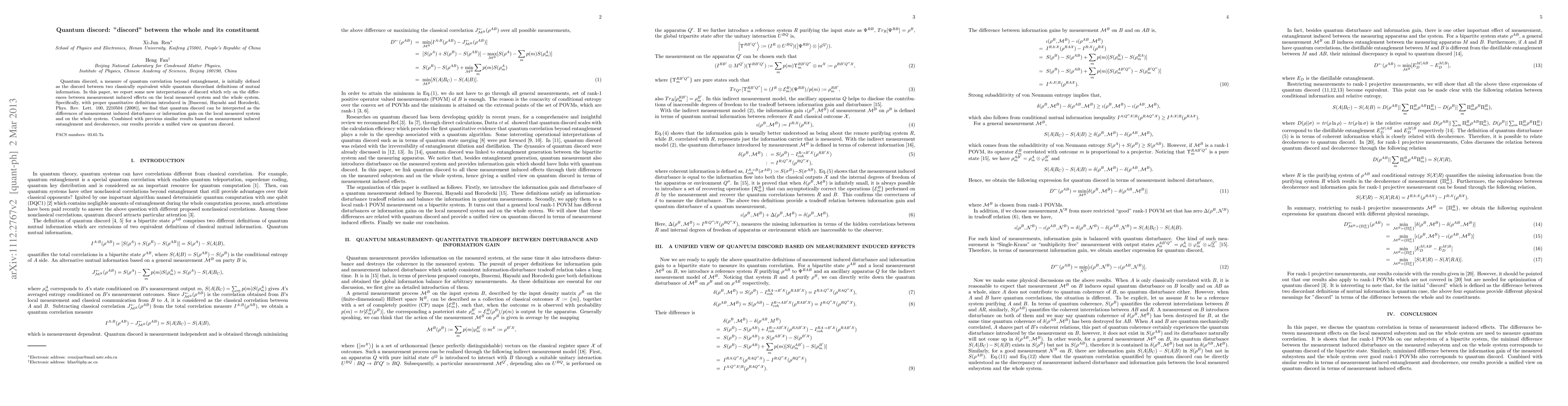 This paper introduces new interpretations of quantum discord, emphasizing its role as a measure of quantum correlation beyond entanglement. It shows that quantum discord can be understood as the difference in measurement-induced disturbance or information gain between the local system and the whole system, providing a unified perspective on quantum discord.