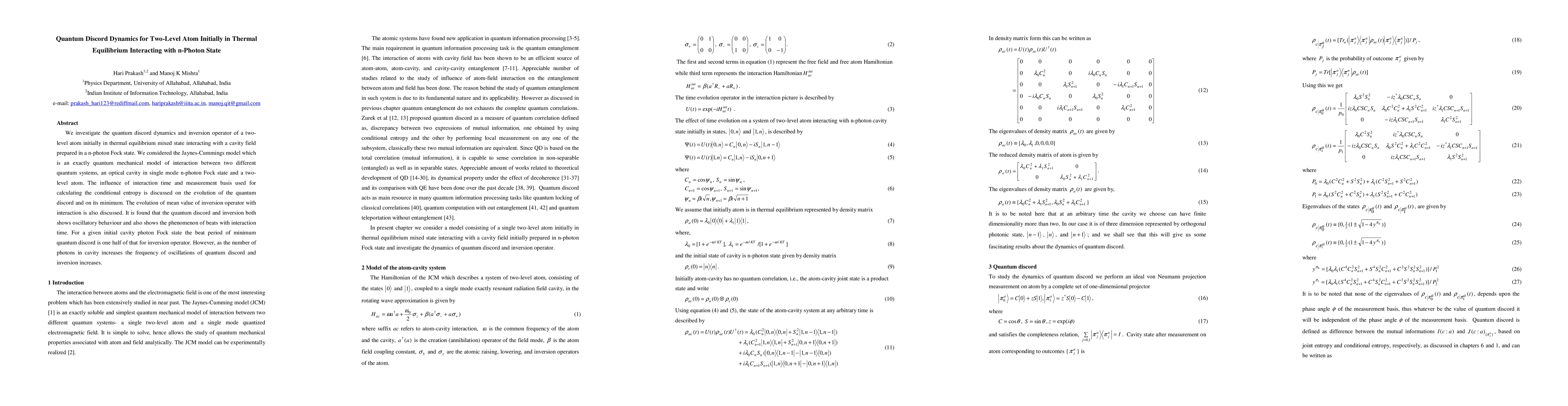 This paper examines the dynamics of quantum discord and the inversion operator in a Jaynes-Cummings model where a two-level atom in thermal equilibrium interacts with a cavity field in an n-photon state. It finds oscillatory behavior and beat phenomena in both quantum discord and inversion, with the beat period for quantum discord being half that of the inversion operator.