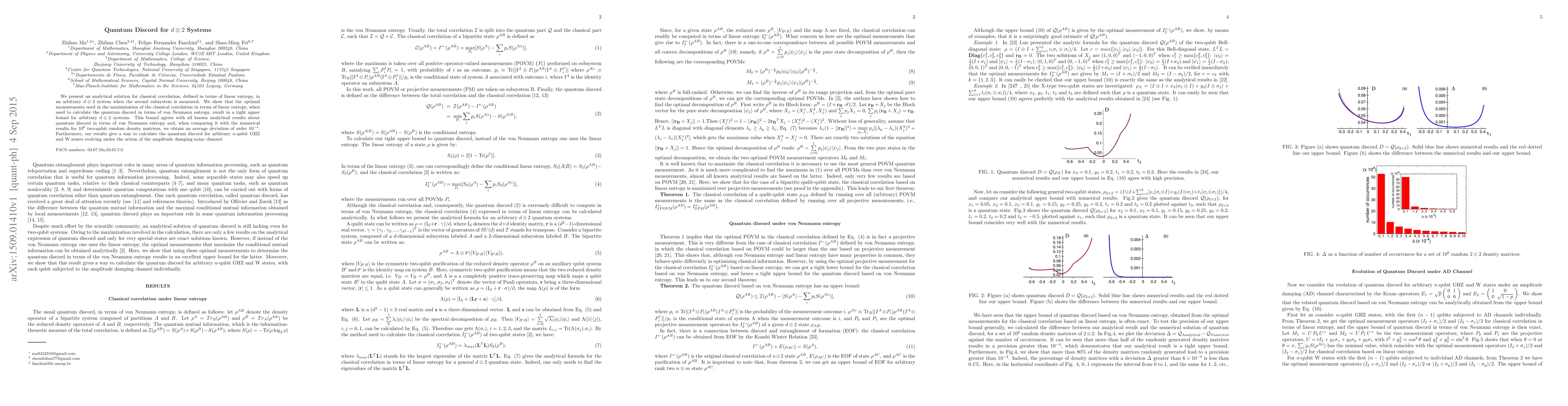 We present an analytical solution for classical correlation, defined in terms of linear entropy, in an arbitrary $d\otimes 2$ system when the second subsystem is measured. We show that the optimal measurements used in the maximization of the classical correlation in terms of linear entropy, when used to calculate the quantum discord in terms of von Neumann entropy, result in a tight upper bound for arbitrary $d\otimes 2$ systems. This bound agrees with all known analytical results about quantum discord in terms of von Neumann entropy and, when comparing it with the numerical results for $10^6$ two-qubit random density matrices, we obtain an average deviation of order $10^{-4}$. Furthermore, our results give a way to calculate the quantum discord for arbitrary $n$-qubit GHZ and W states evolving under the action of the amplitude damping noisy channel.