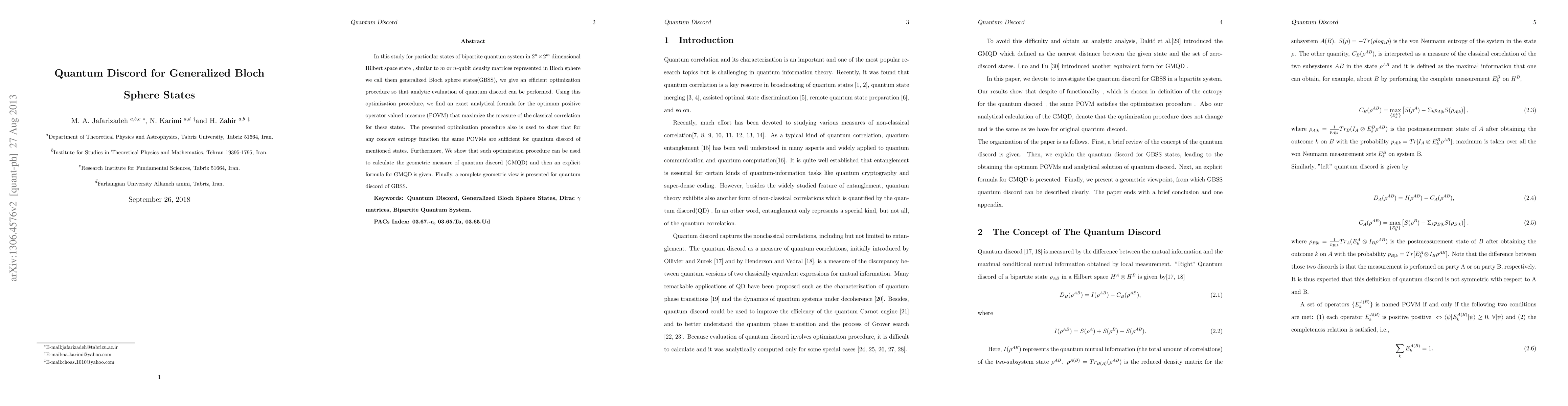 This paper presents an efficient optimization procedure for evaluating quantum discord in generalized Bloch sphere states (GBSS) in a bipartite quantum system. It derives an exact analytical formula for the optimal POVM maximizing classical correlation and provides a geometric measure for quantum discord, offering a comprehensive view of quantum discord in GBSS.
