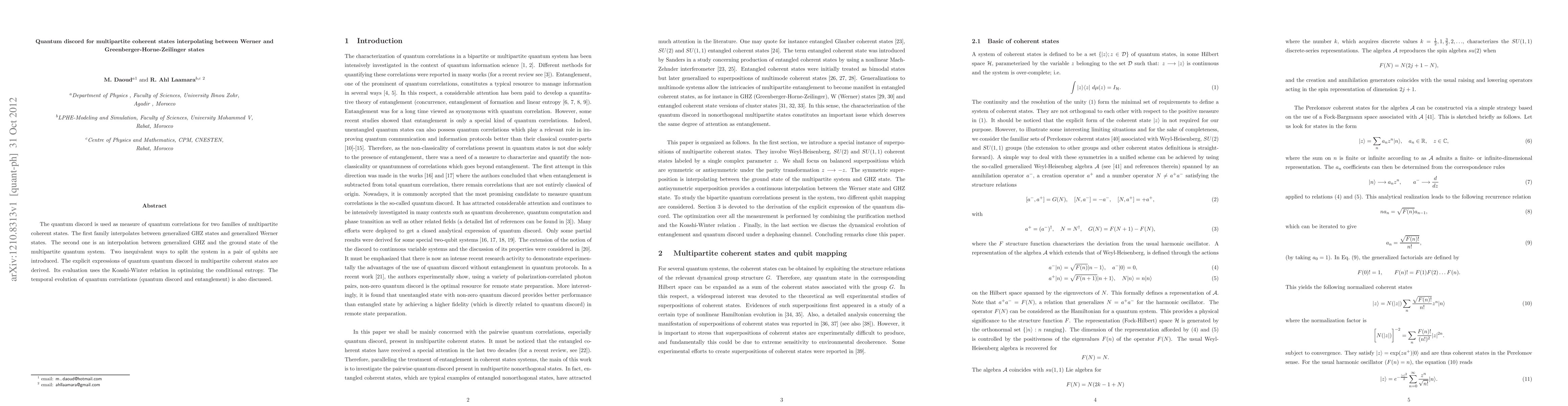 This research paper investigates quantum discord as a measure of quantum correlations for multipartite coherent states, deriving explicit expressions for two interpolation families between generalized GHZ and Werner states. The study also examines temporal evolution of quantum discord and entanglement, using the Koashi-Winter relation to optimize conditional entropy.