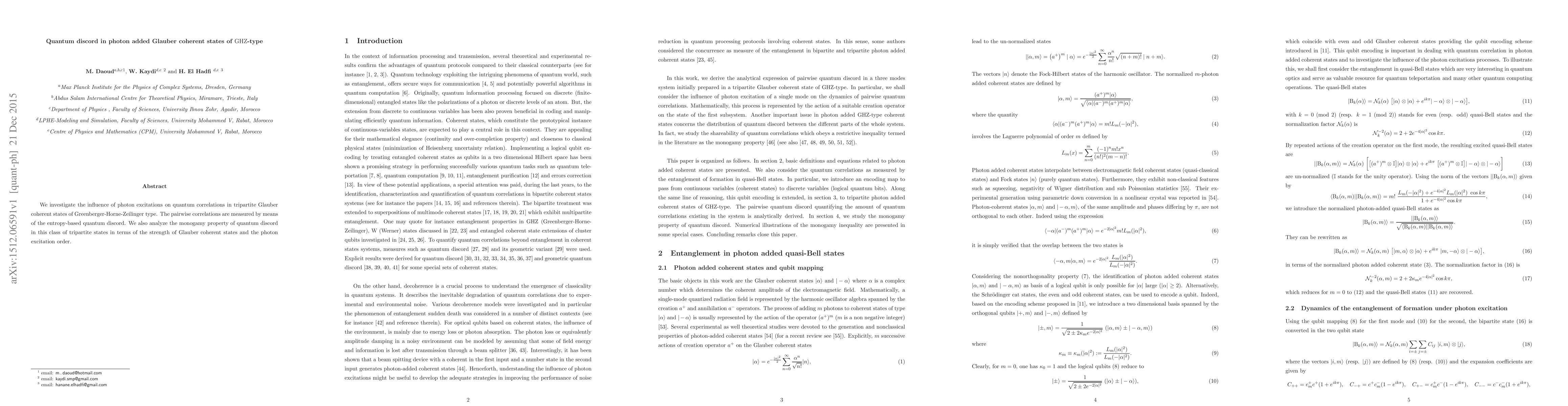 This paper investigates quantum discord in Glauber coherent states of GHZ-type, analyzing correlations with photon excitations, and its relation to monogamy property.