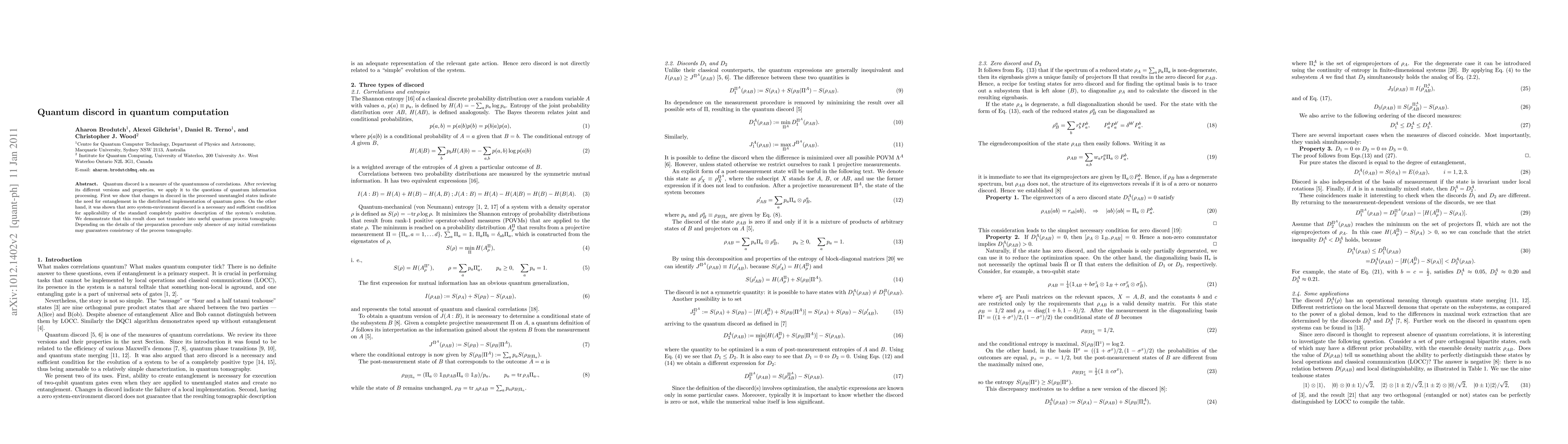 Quantum discord is a measure of quantum correlation that indicates the need for entanglement in quantum computing. Its properties also imply that zero system-environment discord is necessary and sufficient for describing a system's evolution.