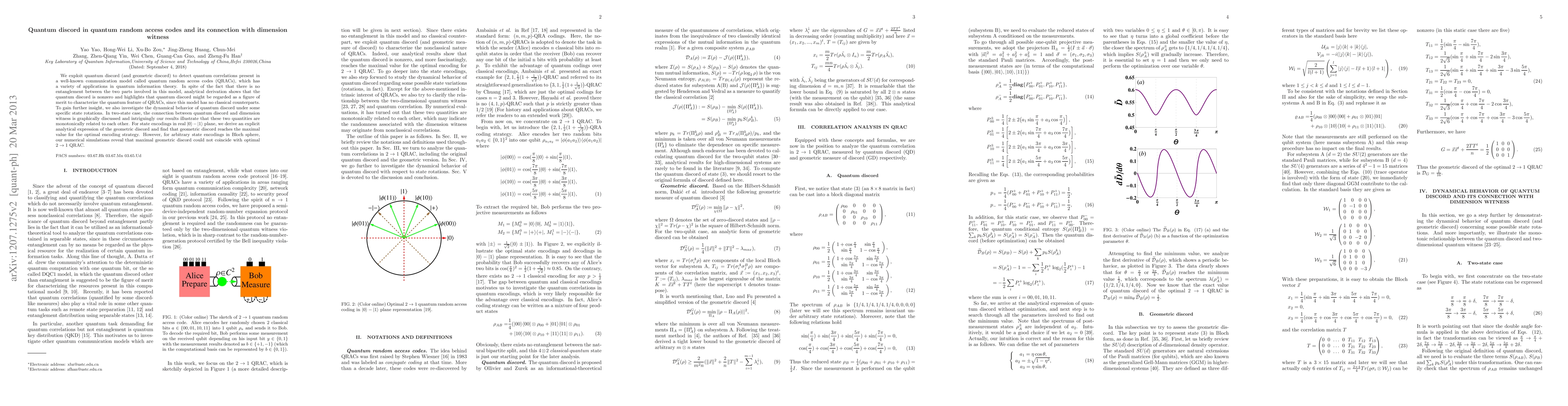 We exploit quantum discord (and geometric discord) to detect quantum correlations present in a well-known communication model called quantum random access codes (QRACs), which has a variety of applications in areas ranging form quantum communication complexity, network coding, information causality, to security proof of QKD protocol. In spite of the fact that there is no entanglement between the two parts involved in this model, analytical derivation shows that the quantum discord is nonzero and highlights that quantum discord might be regarded as a figure of merit to characterize the quantum feature of QRACs, since this model has no classical counterparts. To gain further insight, we also investigate the dynamical behavior of quantum discord under state rotations. As a comparison, the connection between quantum discord and dimension witness is graphically discussed. Interestingly, our results illustrate that these two quantities are monotonically related to each other, which implies that the dimension witness and nonclassical correlations may be intrinsically linked.