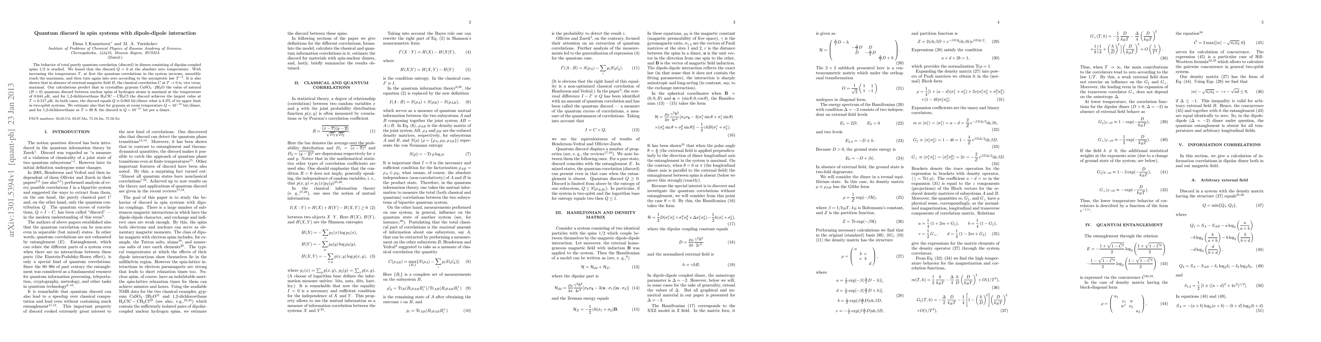 Researchers studied quantum discord in spin systems with dipole-dipole interaction, finding that it reaches a maximum at low temperatures before decreasing as temperature increases.
