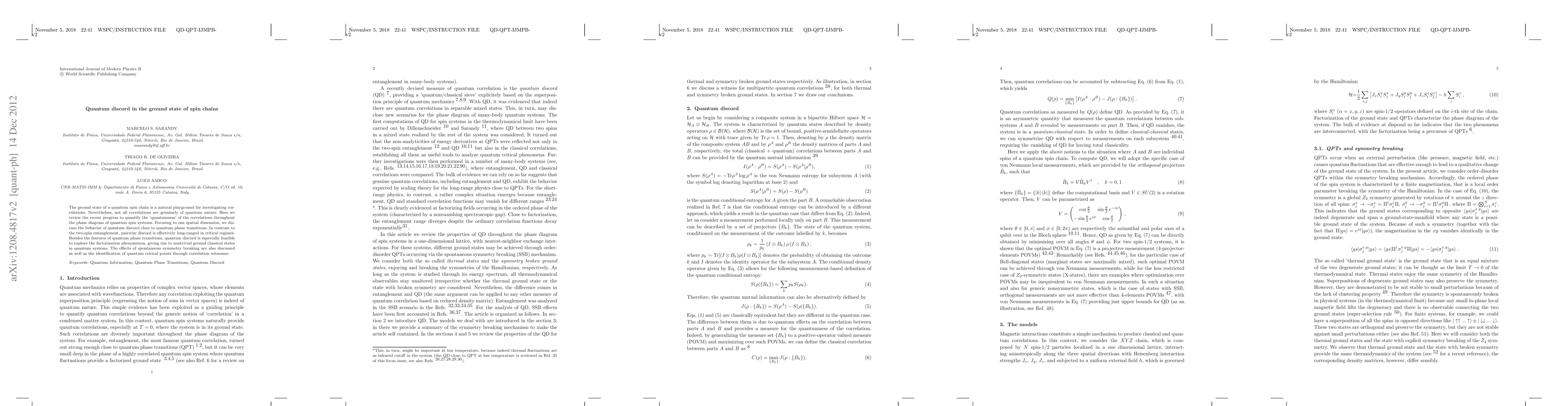 This paper reviews recent advancements in quantifying quantum correlations, specifically quantum discord, in one-dimensional spin chains, highlighting its long-range behavior near quantum phase transitions and its role in identifying quantum critical points and spontaneous symmetry breaking.