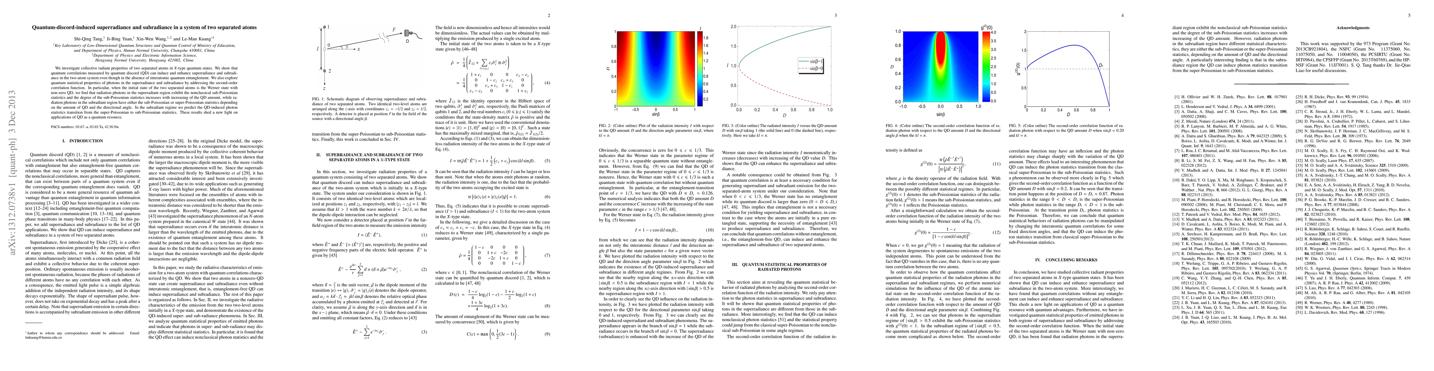 This paper explores how quantum discord can induce superradiance and subradiance in a system of two separated atoms in X-type quantum states, even without interatomic entanglement. It finds that quantum discord enhances photon statistics in superradiant regions, showing sub-Poissonian behavior, while subradiant regions exhibit varied statistics dependent on quantum discord and angle, predicting a transition from super- to sub-Poissonian statistics.
