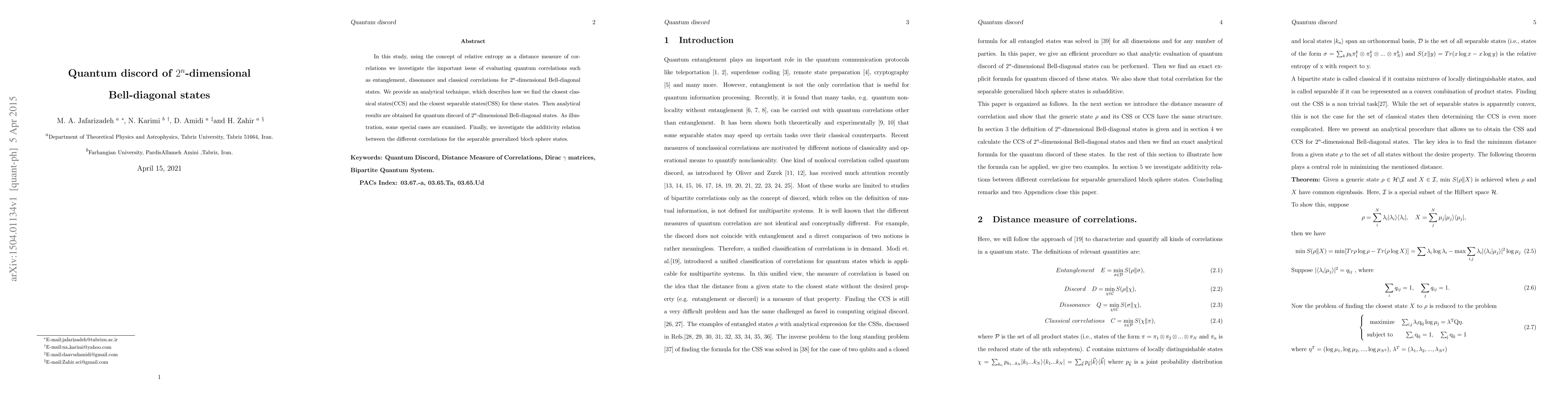 In this study, using the concept of relative entropy as a distance measure of cor- relations we investigate the important issue of evaluating quantum correlations such as entanglement, dissonance and classical correlations for 2n-dimensional Bell-diagonal states. We provide an analytical technique, which describes how we find the closest classical states(CCS) and the closest separable states(CSS) for these states. Then analytical results are obtained for quantum discord of 2n-dimensional Bell-diagonal states. As illustration, some special cases are examined. Finally, we investigate the additivity relation between the different correlations for the separable generalized bloch sphere states.