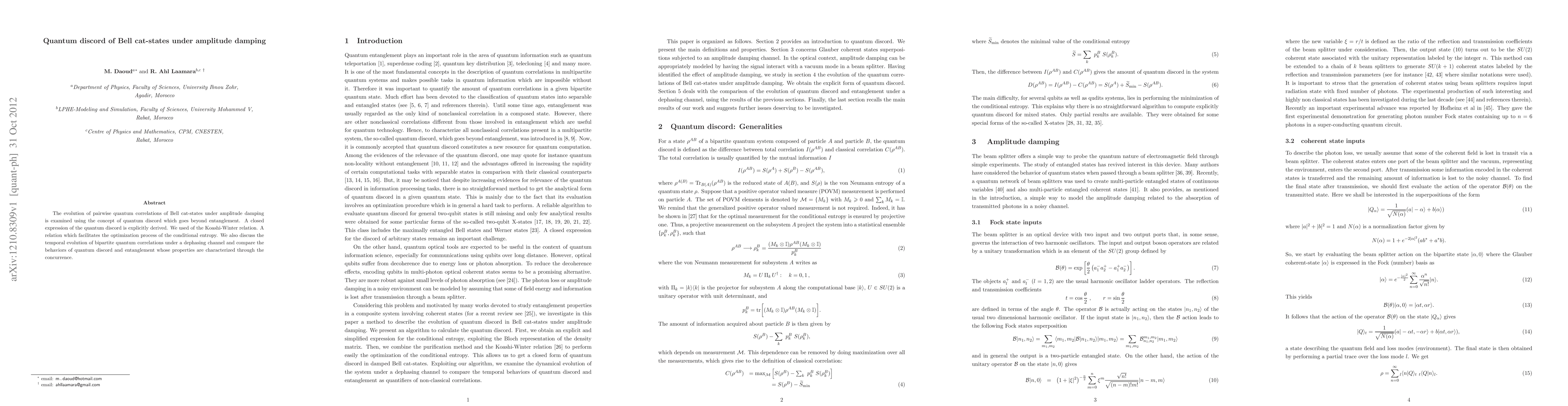 The evolution of pairwise quantum correlations of Bell cat-states under amplitude damping is examined using the concept of quantum discord which goes beyond entanglement. A closed expression of the quantum discord is explicitly derived. We used of the Koashi-Winter relation. A relation which facilitates the optimization process of the conditional entropy. We also discuss the temporal evolution of bipartite quantum correlations under a dephasing channel and compare the behaviors of quantum discord and entanglement whose properties are characterized through the concurrence.