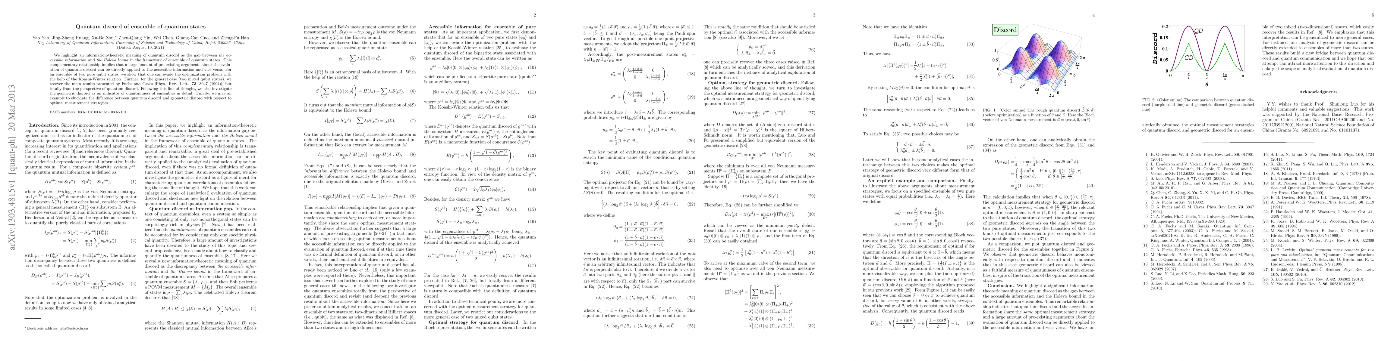 This paper explores the concept of quantum discord in the context of quantum state ensembles, emphasizing its information-theoretic significance as the gap between accessible information and the Holevo bound. It demonstrates how quantum discord can simplify the evaluation of accessible information and discusses the Koashi-Winter relation for pure qubit states, while also comparing results with Fuchs and Caves' findings on mixed qubit states.