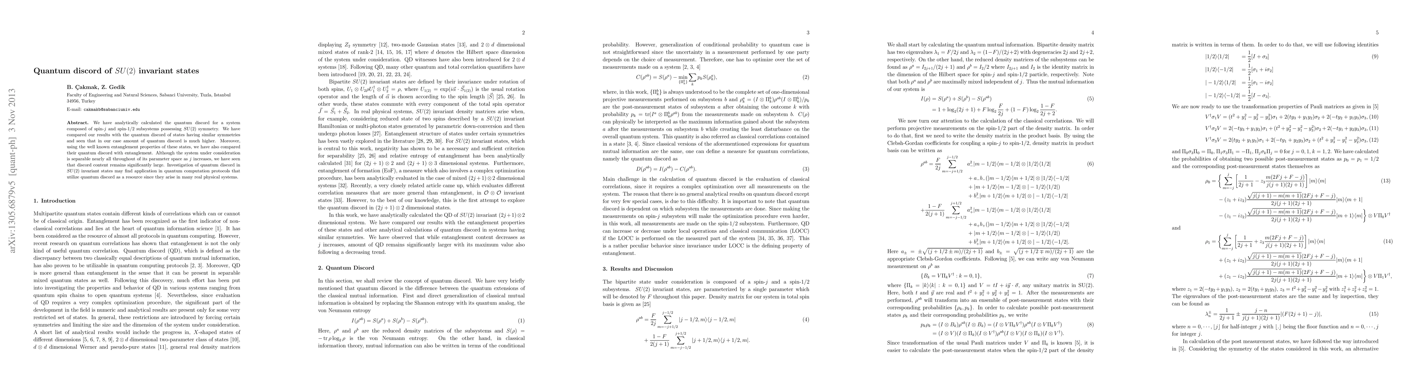 This paper analytically determines the quantum discord for SU(2) invariant spin-$j$ and spin-1/2 subsystems, finding it substantially higher than for similar states. Despite the system's separability as $j$ increases, significant quantum discord remains, suggesting potential applications in quantum computation protocols.