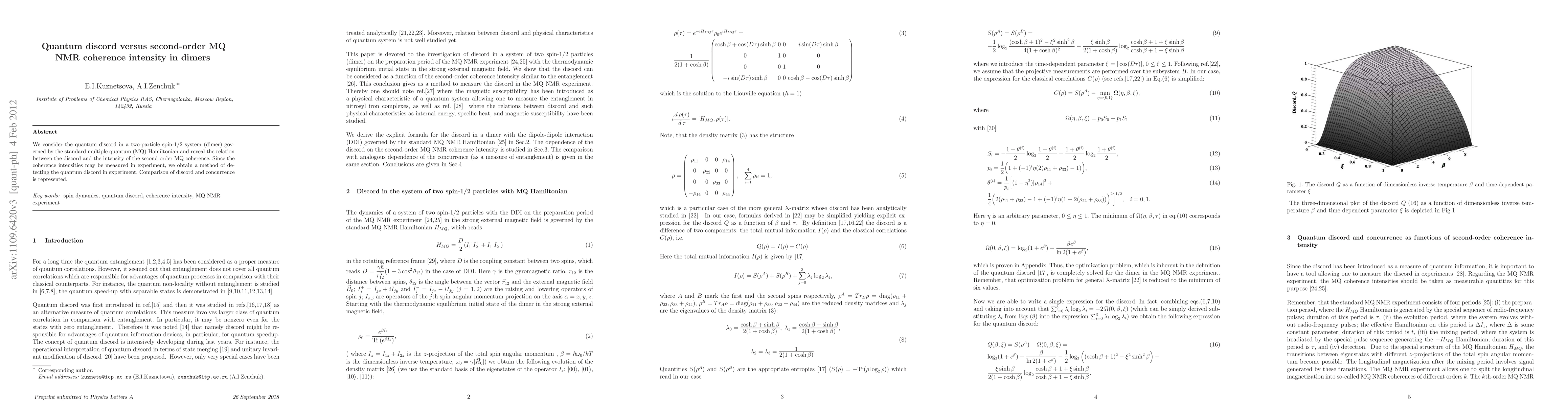 Researchers studied quantum discord in a two-particle spin-1/2 system, finding a relationship between discord and the intensity of second-order MQ coherence, which can be measured experimentally.