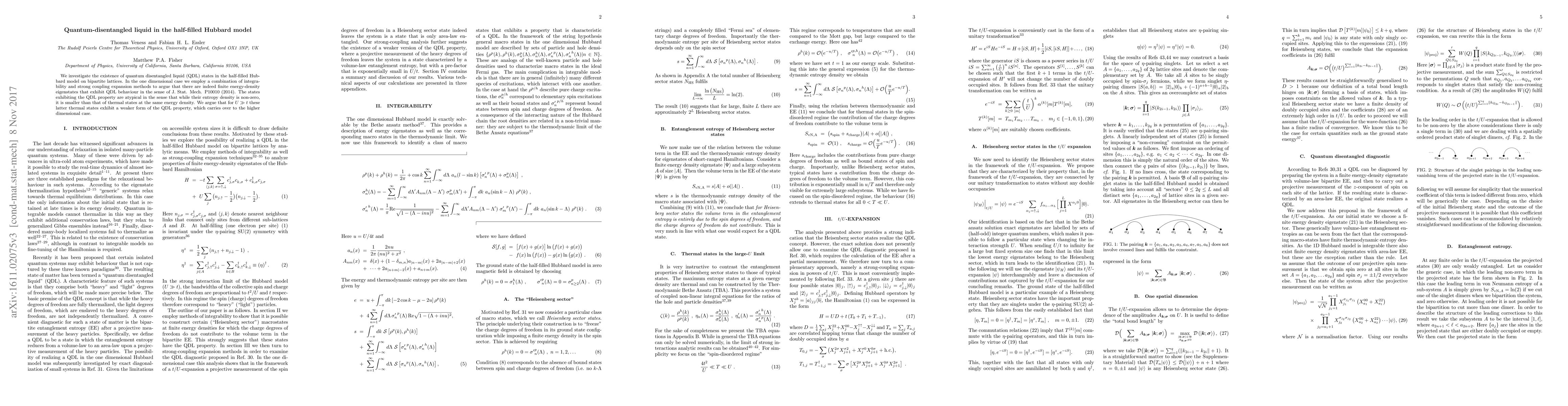 We investigate the existence of quantum disentangled liquid (QDL) states in the half-filled Hubbard model on bipartite lattices. In the one dimensional case we employ a combination of integrability and strong coupling expansion methods to argue that there are indeed finite energy-density eigenstates that exhibit QDL behaviour in the sense of J. Stat. Mech. P10010 (2014). The states exhibiting the QDL property are atypical in the sense that while their entropy density is non-zero, it is smaller than that of thermal states at the same energy density. We argue that for U >> t these latter thermal states exhibit a weaker form of the QDL property, which carries over to the higher dimensional case.