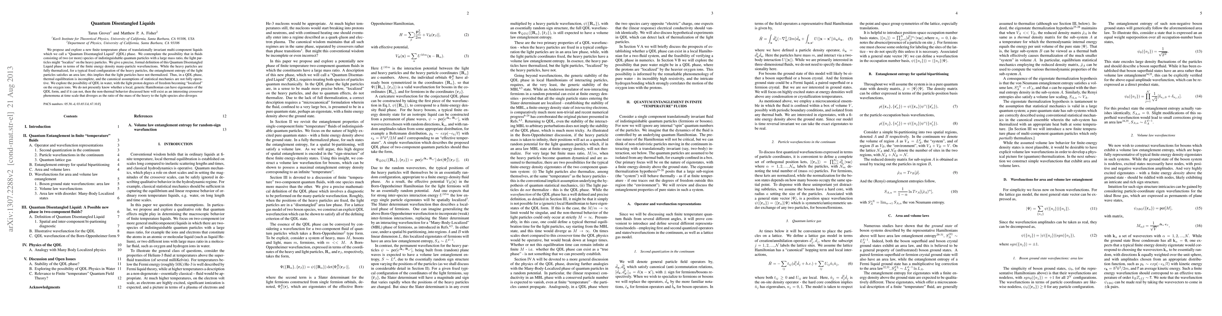 We propose and explore a new finite temperature phase of translationally invariant multi-component liquids which we call a "Quantum Disentangled Liquid" (QDL) phase. We contemplate the possibility that in fluids consisting of two (or more) species of indistinguishable quantum particles with a large mass ratio, the light particles might "localize" on the heavy particles. We give a precise, formal definition of this Quantum Disentangled Liquid phase in terms of the finite energy density many-particle wavefunctions. While the heavy particles are fully thermalized, for a typical fixed configuration of the heavy particles, the entanglement entropy of the light particles satisfies an area law; this implies that the light particles have not thermalized. Thus, in a QDL phase, thermal equilibration is incomplete, and the canonical assumptions of statistical mechanics are not fully operative. We explore the possibility of QDL in water, with the light proton degrees of freedom becoming "localized" on the oxygen ions. We do not presently know whether a local, generic Hamiltonian can have eigenstates of the QDL form, and if it can not, then the non-thermal behavior discussed here will exist as an interesting crossover phenomena at time scales that diverge as the ratio of the mass of the heavy to the light species also diverges.