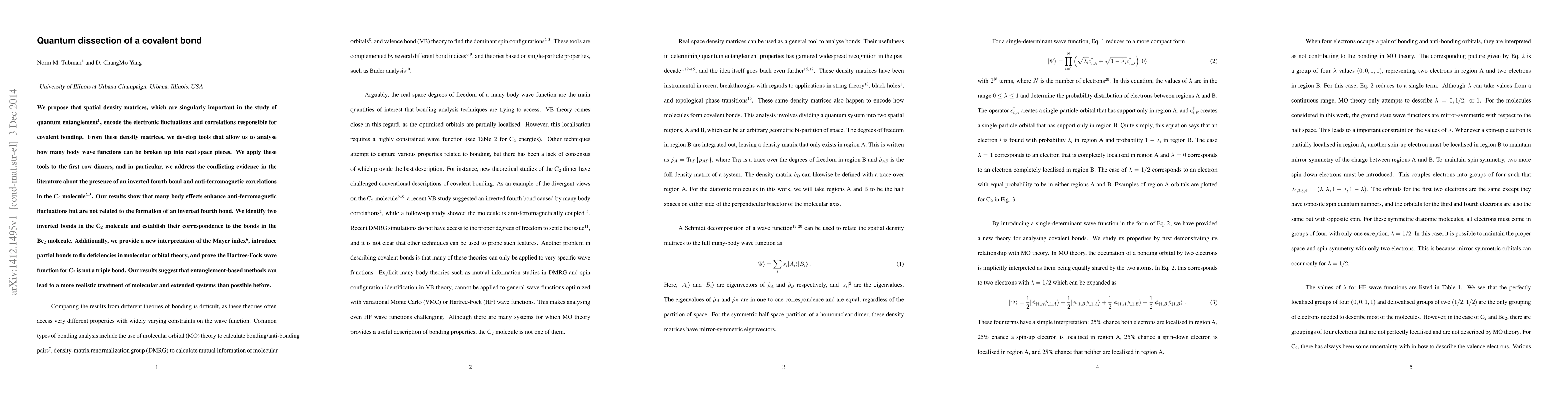 We propose that spatial density matrices, which are singularly important in the study of quantum entanglement, encode the electronic fluctuations and correlations responsible for covalent bonding. From these density matrices, we develop tools that allow us to analyse how many body wave functions can be broken up into real space pieces. We apply these tools to the first row dimers, and in particular, we address the conflicting evidence in the literature about the presence of an inverted fourth bond and anti-ferromagnetic correlations in the $\text{C}_2$ molecule. Our results show that many body effects enhance anti-ferromagnetic fluctuations but are not related to the formation of an inverted fourth bond. We identify two inverted bonds in the $\text{C}_2$ molecule and establish their correspondence to the bonds in the $\text{Be}_2$ molecule. Additionally, we provide a new interpretation of the Mayer index, introduce partial bonds to fix deficiencies in molecular orbital theory, and prove the Hartree-Fock wave function for C$_{2}$ is not a triple bond. Our results suggest that entanglement-based methods can lead to a more realistic treatment of molecular and extended systems than possible before.