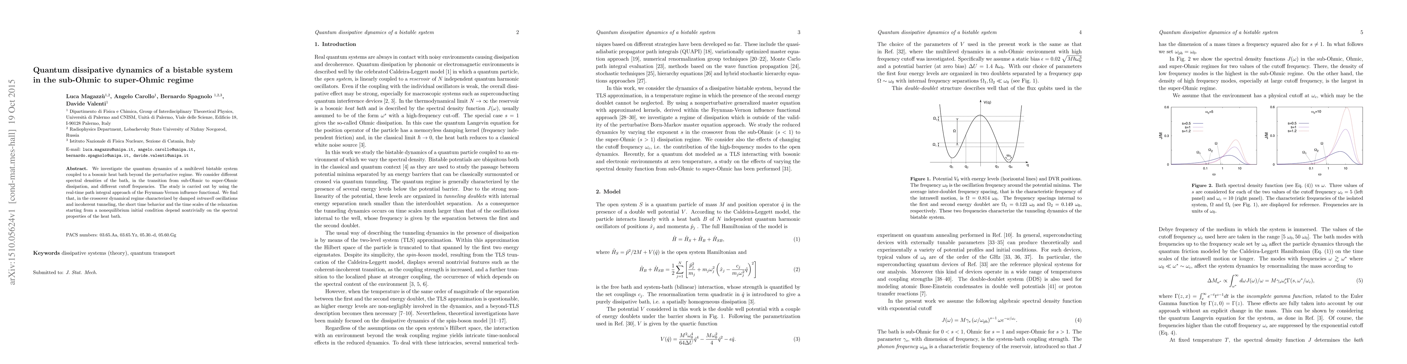 We investigate the quantum dynamics of a multilevel bistable system coupled to a bosonic heat bath beyond the perturbative regime. We consider different spectral densities of the bath, in the transition from sub-Ohmic to super-Ohmic dissipation, and different cutoff frequencies. The study is carried out by using the real-time path integral approach of the Feynman-Vernon influence functional. We find that, in the crossover dynamical regime characterized by damped \emph{intrawell} oscillations and incoherent tunneling, the short time behavior and the time scales of the relaxation starting from a nonequilibrium initial condition depend nontrivially on the spectral properties of the heat bath.