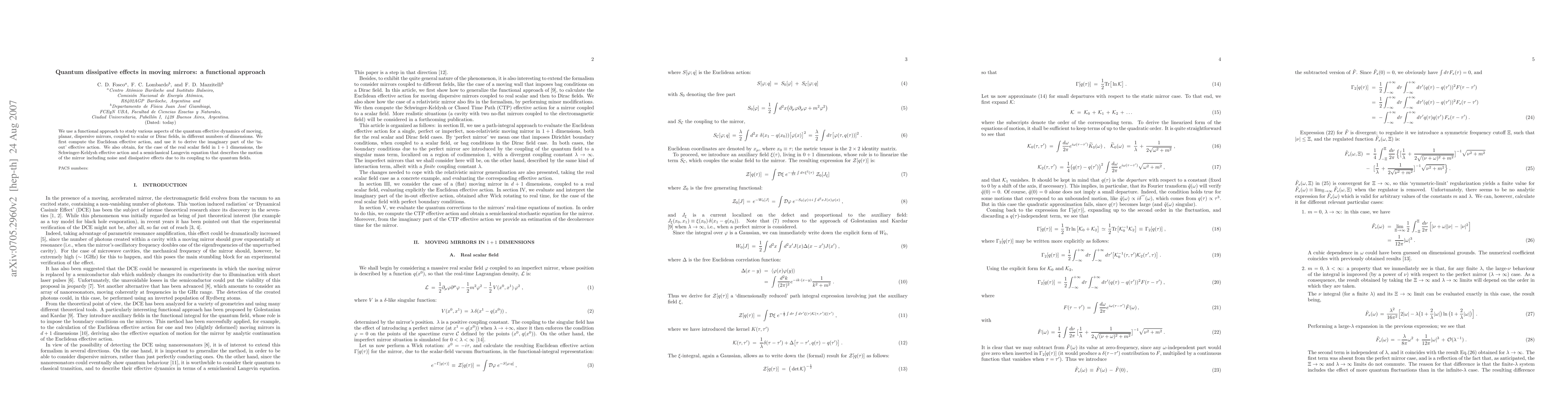 We use a functional approach to study various aspects of the quantum effective dynamics of moving, planar, dispersive mirrors, coupled to scalar or Dirac fields, in different numbers of dimensions. We first compute the Euclidean effective action, and use it to derive the imaginary part of the `in-out' effective action. We also obtain, for the case of the real scalar field in 1+1 dimensions, the Schwinger-Keldysh effective action and a semiclassical Langevin equation that describes the motion of the mirror including noise and dissipative effects due to its coupling to the quantum fields.