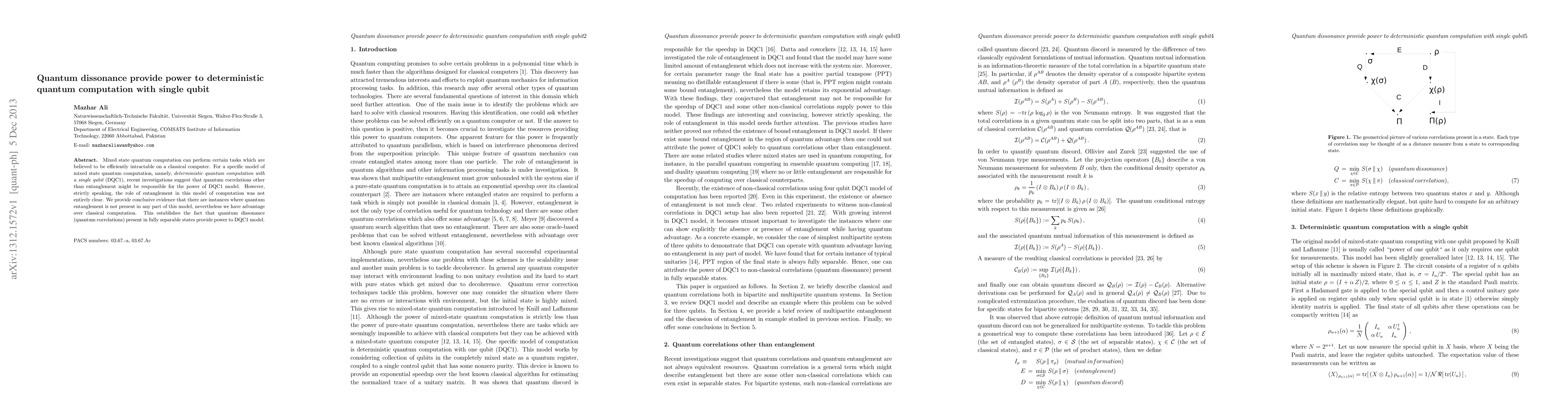 The research demonstrates that quantum correlations, specifically quantum dissonance in fully separable states, can provide computational advantages in deterministic quantum computation with a single qubit (DQC1), even in the absence of entanglement, thereby highlighting a novel source of quantum power.