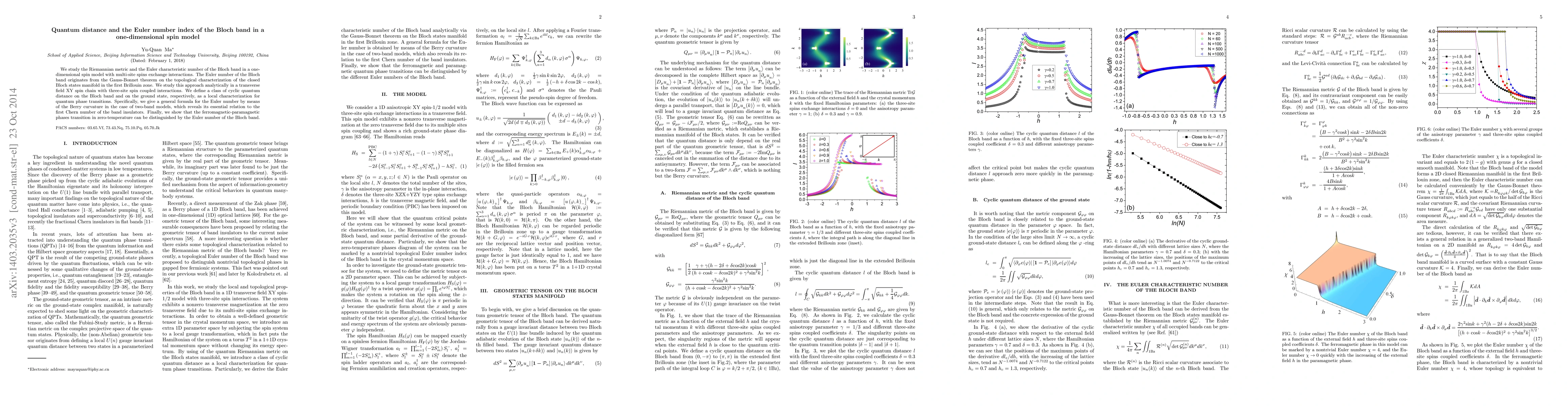 We study the Riemannian metric and the Euler characteristic number of the Bloch band in a 1D spin model with multi-site spins exchange interactions. The Euler number of the Bloch band originates from the Gauss-Bonnet theorem on the topological characterization of the closed Bloch states manifold in the first Brillouin zone. We study this approach analytically in a transverse field XY spin chain with three-site spin coupled interactions. We define a class of cyclic quantum distance on the Bloch band and on the ground state, respectively, as a local characterization for quantum phase transitions. Specifically, we give a general formula for the Euler number by means of the Berry curvature in the case of two-band models, which reveals its essential relation to the first Chern number of the band insulators. Finally, we show that the ferromagnetic-paramagnetic phases transition in zero-temperature can be distinguished by the Euler number of the Bloch band.