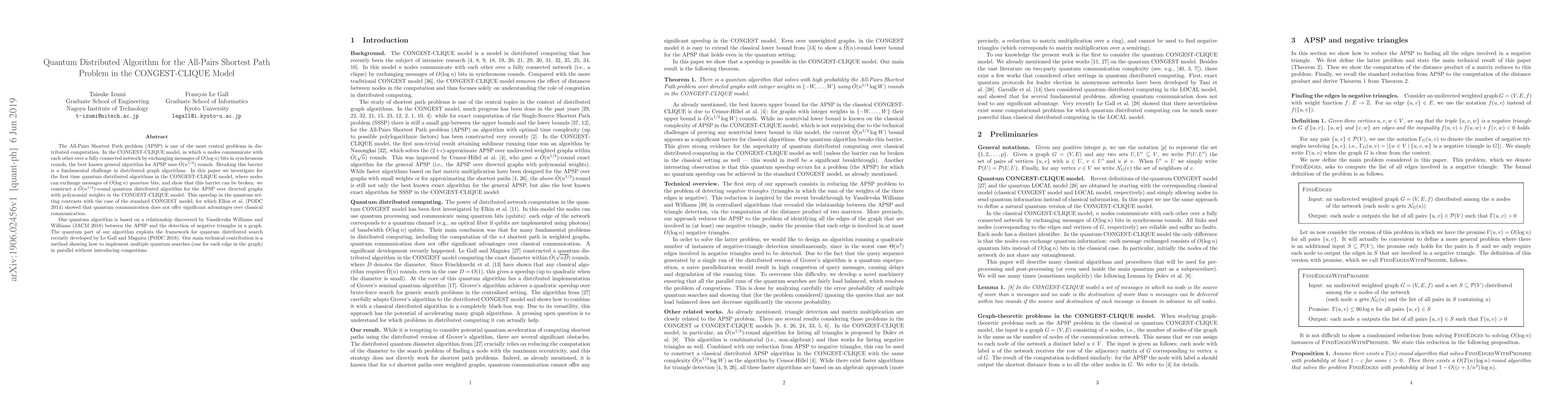 This paper presents a quantum distributed algorithm for solving the All-Pairs Shortest Path problem in the CONGEST-CLIQUE model, achieving a $\tilde O(n^{1/4})$-round complexity, which breaks the $\tilde O(n^{1/3})$ rounds barrier of classical algorithms. The quantum approach leverages a negative triangle detection relationship and parallel quantum searches to achieve this speedup.