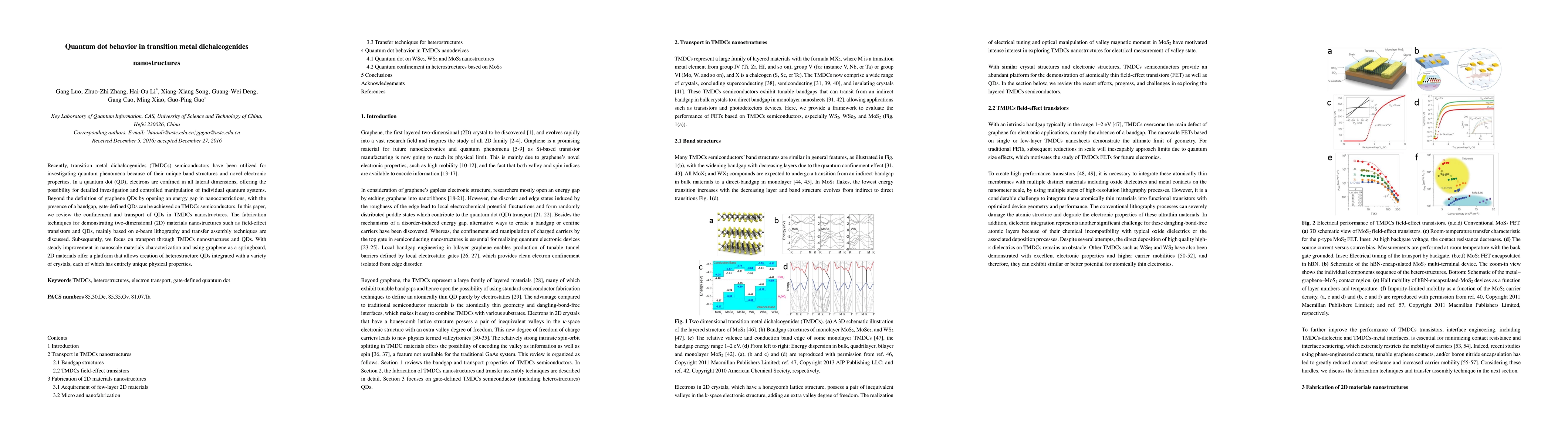 Recently, transition metal dichalcogenides (TMDCs) semiconductors have been utilized for investigating quantum phenomena because of their unique band structures and novel electronic properties. In a quantum dot (QD), electrons are confined in all lateral dimensions, offering the possibility for detailed investigation and controlled manipulation of individual quantum systems. Beyond the definition of graphene QDs by opening an energy gap in nanoconstrictions, with the presence of a bandgap, gate-defined QDs can be achieved on TMDCs semiconductors. In this paper, we review the confinement and transport of QDs in TMDCs nanostructures. The fabrication techniques for demonstrating two-dimensional (2D) materials nanostructures such as field-effect transistors and QDs, mainly based on e-beam lithography and transfer assembly techniques are discussed. Subsequently, we focus on transport through TMDCs nanostructures and QDs. With steady improvement in nanoscale materials characterization and using graphene as a springboard, 2D materials offer a platform that allows creation of heterostructure QDs integrated with a variety of crystals, each of which has entirely unique physical properties.